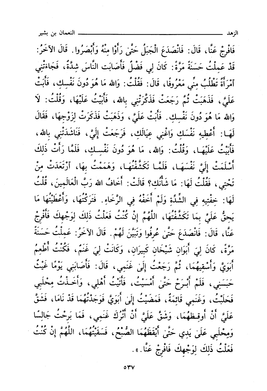 فَافْرُجْ عَنَّا، قَالَ: فَانْصَدَعَ حَتَّى عَرَفُوا وَتَبَيَّنَ لَهُمْ، قَالَ الآخَرُ: عَمِلْتُ حَسَنَةً مَرَّةً، كَانَ لِي أَبَوَانِ شَيْخَانِ كَبِيرَانِ، وَكَانَتْ لِي غَنَمٌ، فَكُنْتُ أُطْعِمُ أَبَوَيَّ وَأَسْقِيهِمَا، ثُمَّ رَجَعْتُ إِلَى غَنَمِي، قَالَ: فَأَصَابَنِي يَوْمًا غَيْثٌ حَبَسَنِي، فَلَمْ