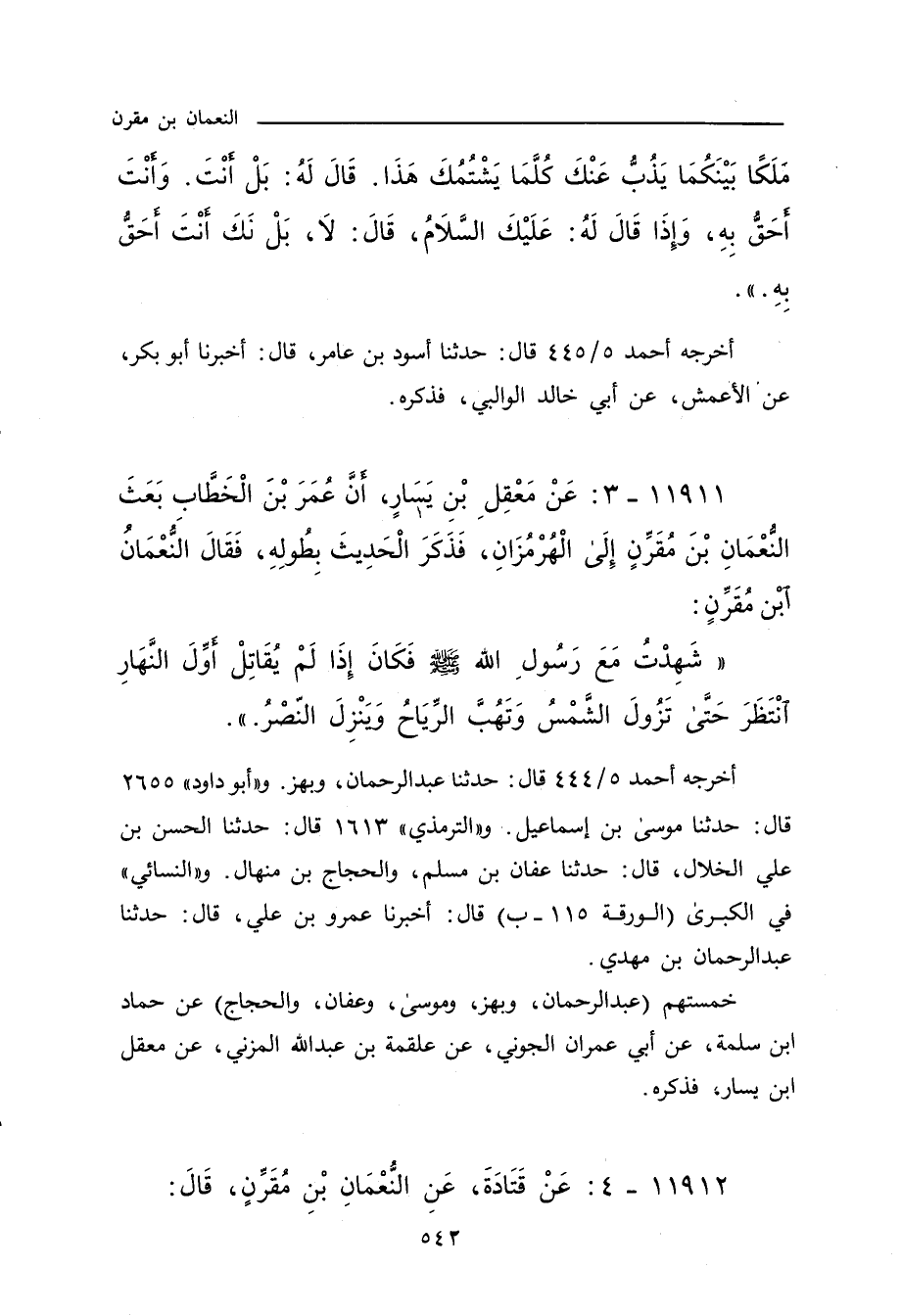 ١١٩١١ - عَنْ مَعْقِلِ بْنِ يَسَارٍ، أَنَّ عُمَرَ بْنَ الْخَطَّابِ بَعَثَ النُّعْمَانَ بْنَ مُقَرِّنٍ إِلَى الْهُرْمُزَانِ، فَذَكَرَ الْحَدِيثَ بِطُولِهِ، فَقَالَ النُّعْمَانُ بْنُ مُقَرِّنٍ: