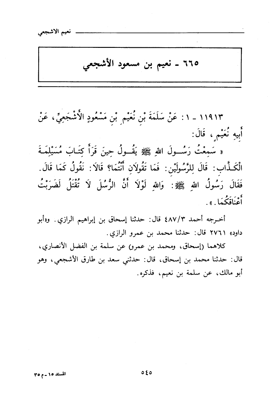 ١١٩١٣ - عَنْ سَلَمَةَ بْنِ نُعَيْمِ بْنِ مَسْعُودٍ الأَشْجَعِيِّ، عَنْ أَبِيهِ نُعَيْمٍ، قَالَ: