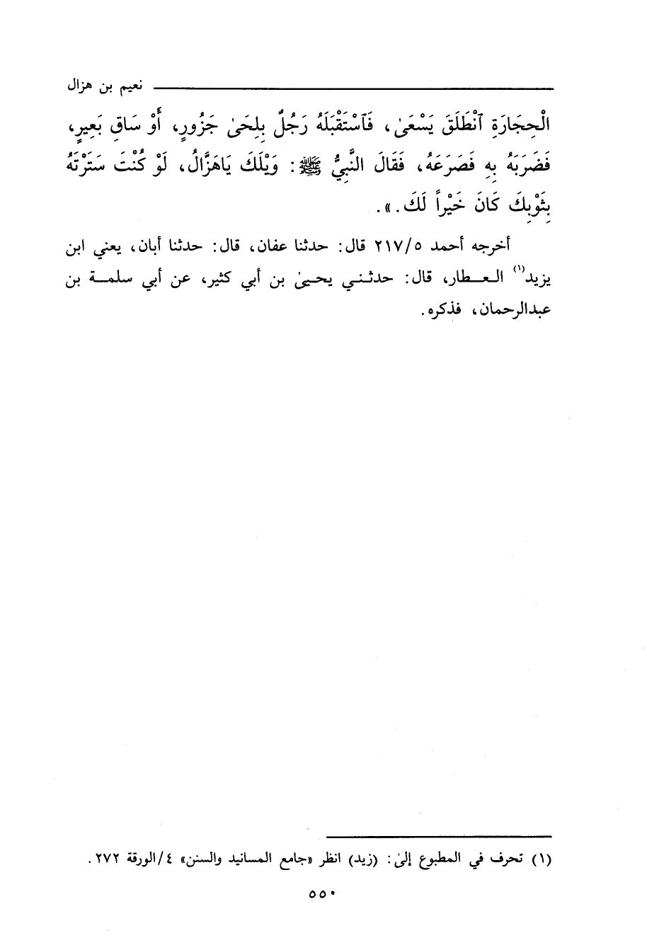 الْحِجَارَةِ انْطَلَقَ يَسْعَى، فَاسْتَقْبَلَهُ رَجُلٌ بِلَحْيِ جَزُورٍ، أَوْ سَاقِ بَعِيرٍ، فَضَرَبَهُ بِهِ، فَصَرَعَهُ، فَقَالَ النَّبِيُّ صلى الله عليه وسلم: وَيْلَكَ يَا هَزَّالُ، لَوْ كُنْتَ سَتَرْتَهُ بِثَوْبِكَ كَانَ خَيْرًا لَكَ.