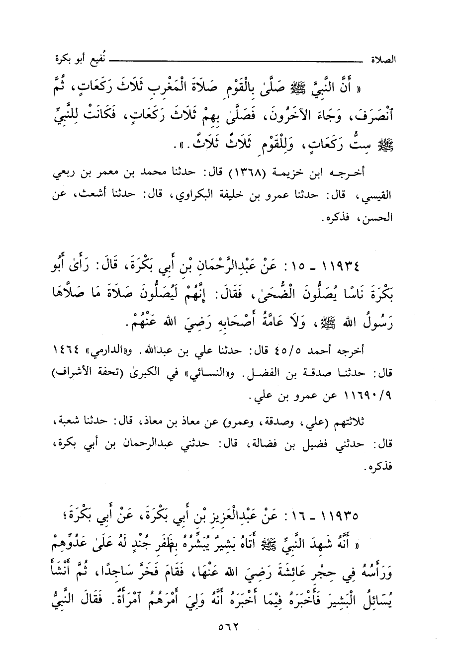 ١١٩٣٤ - عَنْ عَبْدِ الرَّحْمَانِ بْنُ أَبِي بَكْرَةَ، قَالَ: رَأَى أَبُو بَكْرَةَ نَاسًا يُصَلُّونَ الضُّحَى، فَقَالَ: إِنَّهُمْ لَيُصَلُّونَ صَلَاةً مَا صَلَاّهَا رَسُولُ اللهِ صلى الله عليه وسلم، وَلَا عَامَّةُ أَصْحَابِهِ، رَضِيَ اللهُ عَنْهُمْ.
