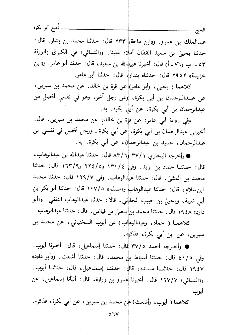 كلاهما (حماد، وعبد الوهاب) عن أيوب السختياني، عن محمد بن سيرين، عَنِ ابْنِ أَبِي بَكْرَةَ، عَنْ أَبِى بَكْرَةَ، فذكره.