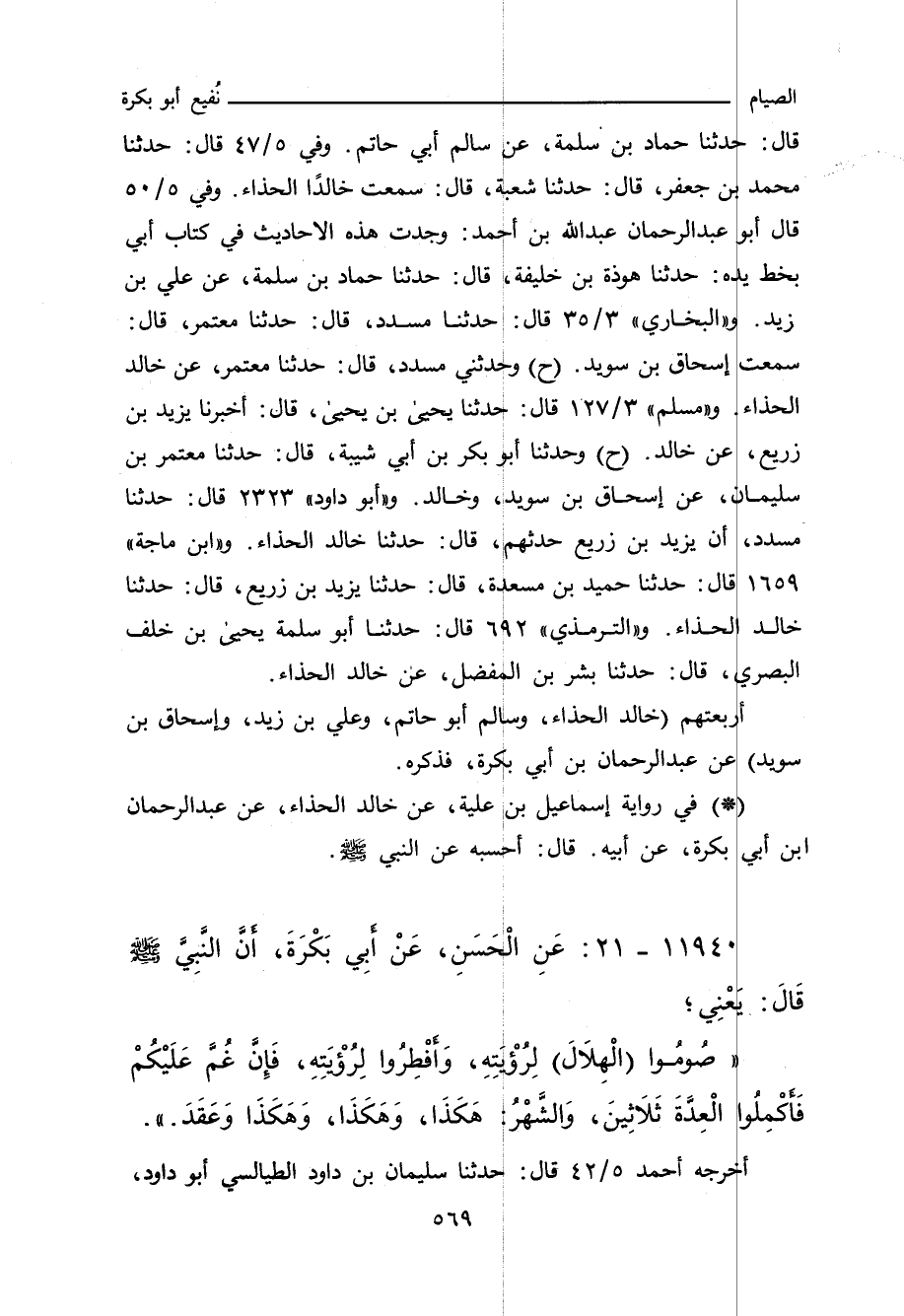حدَّثنا حماد بن سلمة، عن سالم أبي حاتم، وقال رَوْح: عن سالم أبي عُبَيد الله بن سالم (وقال أحمد بن حنبل: وحدَّثنا عَفَّان في حديث ذكره، عن حَمَّاد، عن سالم أبي عُبَيد الله، وهو أيضًا يُكْنَى أبا حاتم". وفي ٥/ ٤٧ (٢٠٧٥٩) قال: حدَّثنا محمد بن جعفر، حدَّثنا شعبة، قال: سمعت خالدًا الحذاء. وفي ٥/ ٥٠ (٢٠٧٨٥) قال أبو عبد الرَّحْمان، عبد الله بن أحمد: وجدت هذه الاحاديث في كتاب أبي بخط يده: حدَّثنا هوذة بن خليفة، حدَّثنا حماد بن سلمة، عن علي بن زيد. و"البُخَارِي" ٣/ ٣٥ (١٩١٢) قال: حدَّثنا مسدد، حدَّثنا معتمر، قال: سمعت إسحاق بن سويد (ح) وحدثني مسدد، حدَّثنا معتمر، عن خالد الحذاء. و"مسلم"٣/ ١٢٧ (٢٤٩٨) قال: حدَّثنا يحيى بن يحيى، قال: أَخْبَرنا يزيد بن زريع، عن خالد. وفي (٢٤٩٩) قال: حدَّثنا أبو بكر بن أبي شيبة، قال: حدَّثنا معتمر بن سليمان، عن إسحاق بن سويد، وخالد. و"أبو داود"٢٣٢٣ قال: حدَّثنا مسدد، أن يزيد بن زريع حدثهم، حدَّثنا خالد الحذاء. و"ابن ماجة"١٦٥٩ قال: حدَّثنا حميد بن مسعدة، حدَّثنا يزيد بن زريع، حدَّثنا خالد الحذاء. و"التِّرمِذي"٦٩٢ قال: حدَّثنا أبو سلمة، يحيى بن خلف البصري، حدَّثنا بشر بن المفضل، عن خالد الحذاء.