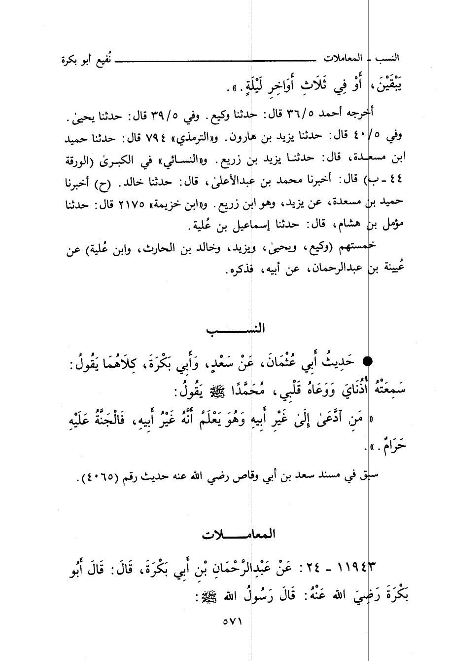 ١١٩٤٣ - عَنْ عَبْدِ الرَّحْمَانِ بْنِ أَبِي بَكْرَةَ، قَالَ: قَالَ أَبُو بَكْرَةَ، رَضِيَ اللهُ عَنْهُ، قَالَ رَسُولُ اللهِ صلى الله عليه وسلم: