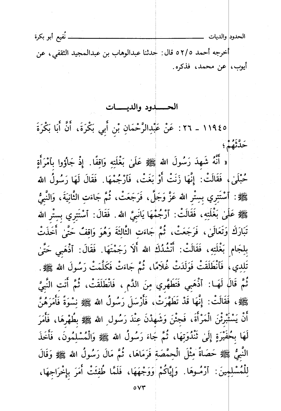 أَنَّهُ شَهِدَ رَسُولَ اللهِ صلى الله عليه وسلم عَلَى بَغْلَتِهِ وَاقِفًا، إِذْ جَاؤوا بِامْرَأَةٍ حُبْلَى، فَقَالَتْ: إِنَّهَا زَنَتْ، أَوْ بَغَتْ، فَارْجُمْهَا، فَقَالَ لَهَا رَسُولُ اللهِ صلى الله عليه وسلم: اسْتَتِرِي بِسِتْرِ اللهِ، عَزَّ وَجَلَّ، فَرَجَعَتْ، ثُمَّ جَاءَتِ الثَّانِيَةَ، وَالنَّبِيُّ صلى الله عليه وسلم عَلَى بَغْلَتِهِ، فَقَالَتْ: ارْجُمْهَا يَا نَبِيَّ اللهِ، فَقَالَ: اسْتَتِرِي بِسِتْرِ اللهِ تَبَارَكَ وَتَعَالَى، فَرَجَعَتْ، ثُمَّ جَاءَتِ الثَّالِثَةَ وَهُوَ وَاقِفٌ حَتَّى أَخَذَتْ بِلِجَامِ بَغْلَتِهِ، فَقَالَتْ: أَنْشُدُكَ اللهَ إِلَاّ رَجَمْتَهَا، فَقَالَ: اذْهَبِي حَتَّى تَلِدِي، فَانْطَلَقَتْ فَوَلَدَتْ غُلَامًا، ثُمَّ جَاءَتْ فَكَلَّمَتْ رَسُولَ اللهِ صلى الله عليه وسلم، ثُمَّ قَالَ لَهَا: اذْهَبِي فَتَطَهَّرِي مِنَ الدَّمِ، فَانْطَلَقَتْ، ثُمَّ أَتَتِ النَّبِيَّ صلى الله عليه وسلم، فَقَالَتْ: إِنَّهَا قَدْ تَطَهَّرَتْ، فَأَرْسَلَ رَسُولُ اللهِ صلى الله عليه وسلم نِسْوَةً فَأَمَرَهُنَّ أَنْ يَسْتَبْرِئْنَ الْمَرْأَةَ، فَجِئْنَ فَشَهِدْنَ عِنْدَ رَسُولِ اللهِ صلى الله عليه وسلم بِطُهْرِهَا، فَأَمَرَ لَهَا بِحُفَيْرَةٍ إِلَى ثَنْدُوَتِهَا، ثُمَّ جَاءَ رَسُولُ اللهِ صلى الله عليه وسلم وَالْمُسْلِمُونَ، فَأَخَذَ النَّبِيُّ صلى الله عليه وسلم حَصَاةً مِثْلَ الْحِمَّصَةِ فَرَمَاهَا، ثُمَّ مَالَ رَسُولُ اللهِ صلى الله عليه وسلم، وَقَالَ لِلْمُسْلِمِينَ: ارْمُوهَا، وَإِيَّاكُمْ وَوَجْهَهَا، فَلَمَّا طَفِئَتْ أَمَرَ بِإِخْرَاجِهَا،