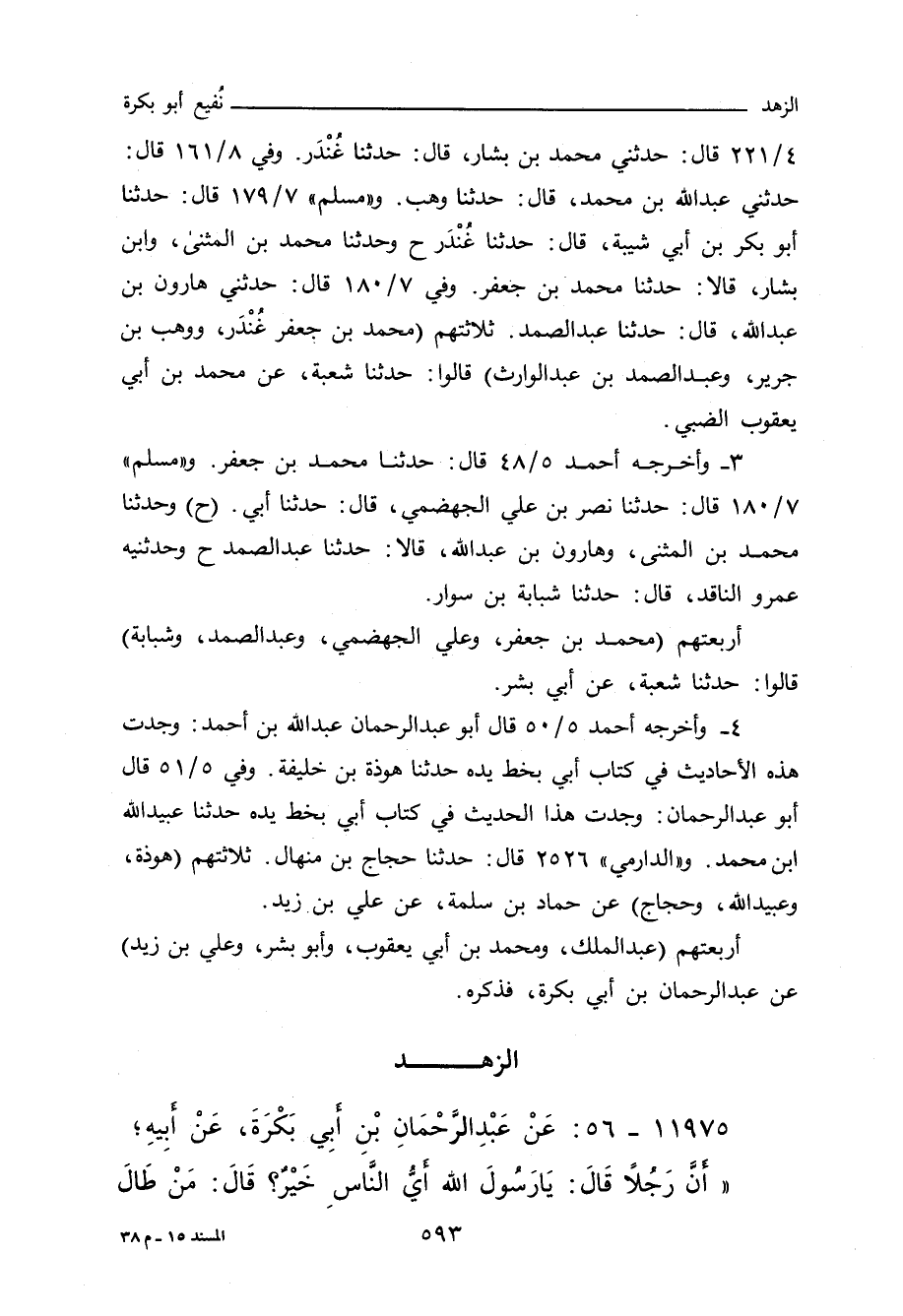 حدثني محمد بن بشار، حدَّثنا غُنْدَر، حدَّثنا شُعْبة، عن مُحَمد بن أبي يعقوب. وفي ٨/ ١٦١ (٦٦٣٥) قال: حدثني عبد الله بن محمد، حدَّثنا وهب، حدَّثنا شُعْبة، عن مُحَمد بن أبي يعقوب. و"مسلم"٧/ ١٧٩ (٦٥٣١) قال: حدثنا أبو بكر بن أبي شيبة، حدَّثنا غُنْدَر، عن شُعْبة (ح) وحدثنا محمد بن المثنى، وابن بشار، قالا: حدَّثنا محمد بن جعفر، حدَّثنا شُعْبة، عن مُحَمد بن أبي يعقوب. وفي ٧/ ١٨٠ (٦٥٣٢) قال: حدثني هارون بن عبد الله، حدَّثنا عبد الصمد، حدَّثنا شُعْبة، حدَّثني سَيِّد بني تَمِيم، مُحَمَّد بن عبد الله بن أبي يعقوب الضَّبِّي. وفي (٦٥٣٣) قال: حدَّثنا نصر بن علي الجهضمي، حدَّثنا أبي، حدَّثنا شُعْبة، عن أبي بِشْر. وفي (٦٥٣٤) قال: حدَّثنا محمد بن المثنى، وهارون بن عبد الله، قالا: