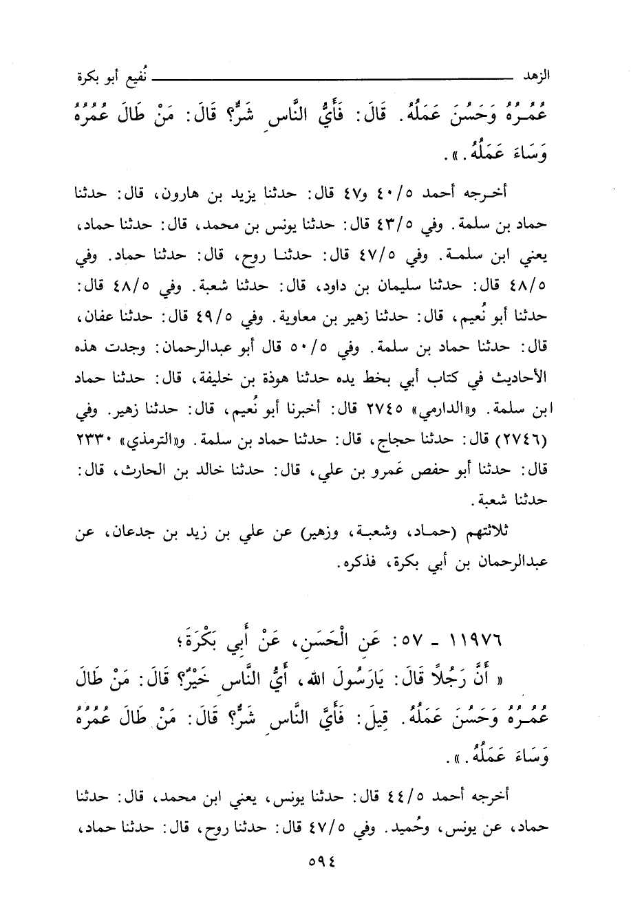أَنَّ رَجُلاً قَالَ: يَا رَسُولَ اللهِ، أَيُّ النَّاسِ خَيْرٌ؟ قَالَ: مَنْ طَالَ عُمُرُهُ، وَحَسُنَ عَمَلُهُ، قِيلَ: فَأَيُّ النَّاسِ شَرٌّ؟ قَالَ: مَنْ طَالَ عُمُرُهُ، وَسَاءَ عَمَلُهُ. حم (٢٠٧٥٥)