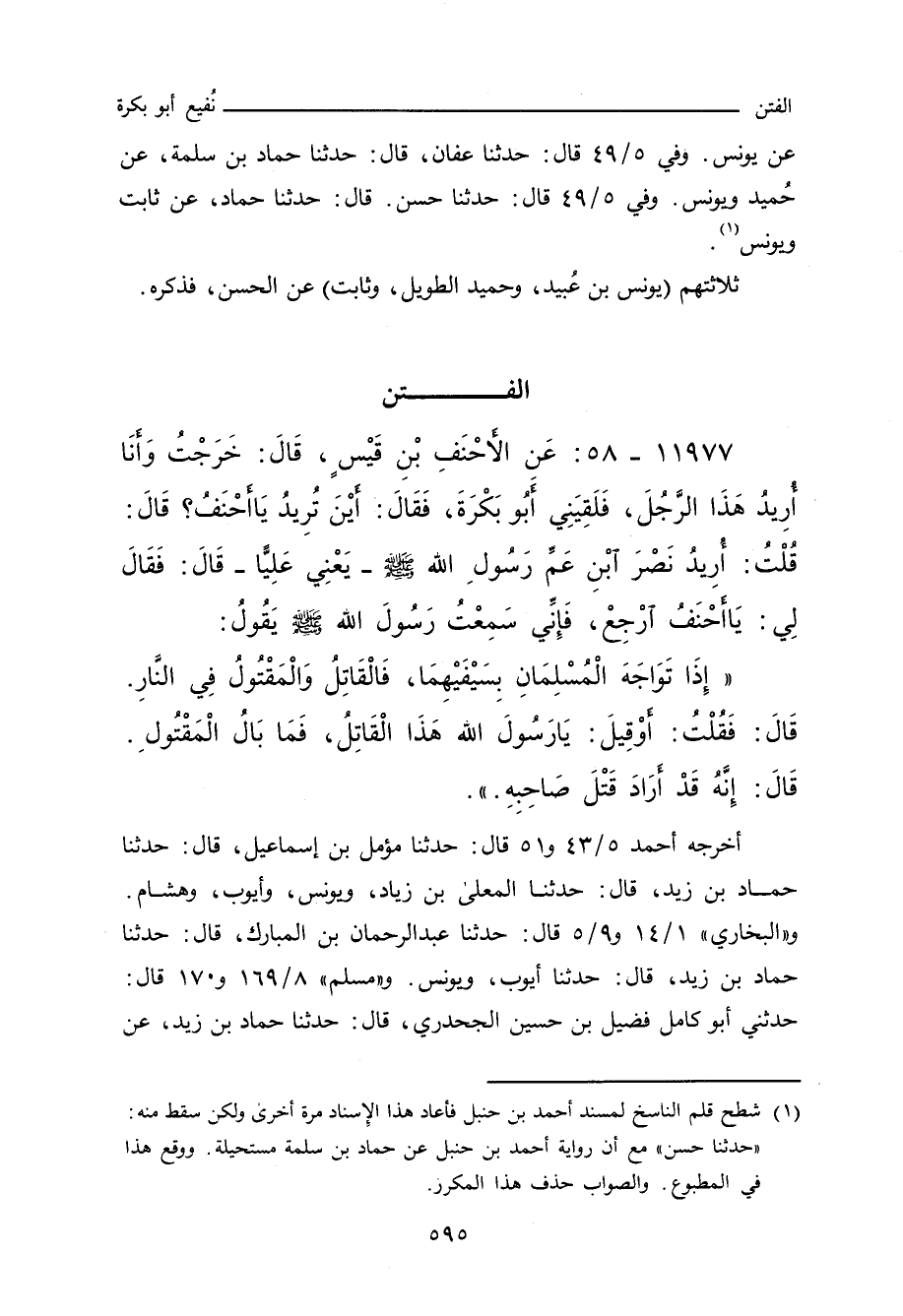١١٩٧٧ - عَنِ الأَحْنَفِ بْنِ قَيْسٍ، قَالَ: خَرَجْتُ وَأَنَا أُرِيدُ هَذَا الرَّجُلَ، فَلَقِيَنِي أَبُو بَكْرَةَ، فَقَالَ: أَيْنَ تُرِيدُ يَا أَحْنَفُ؟ قَالَ: قُلْتُ: أُرِيدُ نَصْرَ ابْنِ عَمِّ رَسُولِ اللهِ صلى الله عليه وسلم، يَعْنِي عَلِيًّا، قَالَ: فَقَالَ لِي: يَا أَحْنَفُ ارْجِعْ، فَإِنِّي سَمِعْتُ رَسُولَ اللهِ صلى الله عليه وسلم يَقُولُ: