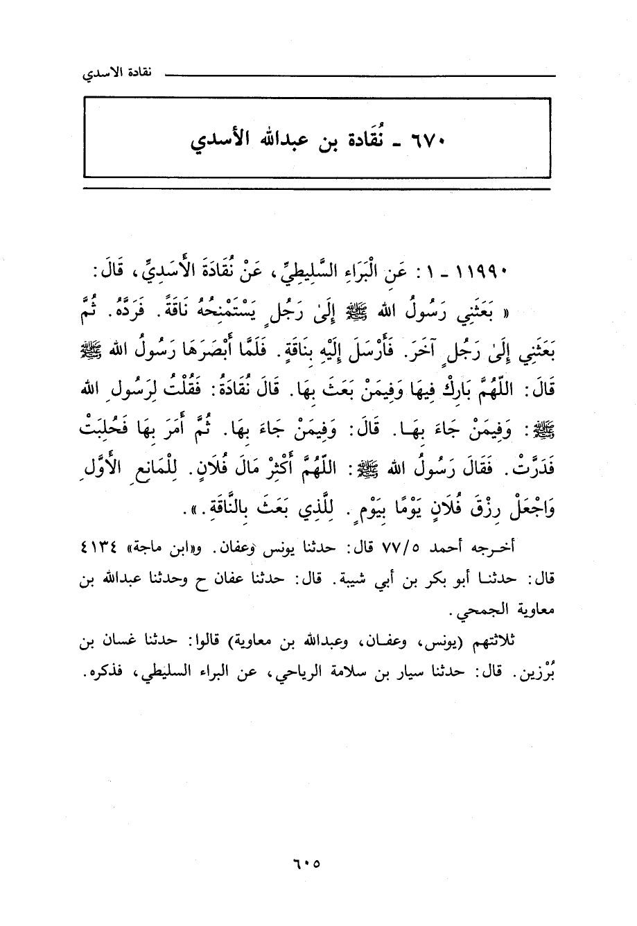 أَنَّ رَسُولَ اللهِ صلى الله عليه وسلم كَانَ بَعَثَ نُقَادَةَ الأَسَدِيَّ إِلَى رَجُلٍ يَسْتَمْنِحُهُ نَاقَةً لَهُ، وَأَنَّ الرَّجُلَ رَدَّهُ، فَأَرْسَلَ بِهِ إِلَى رَجُلٍ آخَرَ سِوَاهُ، فَبَعَثَ إِلَيْهِ بِنَاقَةٍ، فَلَمَّا أَبْصَرَهَا رَسُولُ اللهِ صلى الله عليه وسلم قَدْ جَاءَ بِهَا نُقَادَةُ يَقُودُهَا، قَالَ: اللَّهُمَّ بَارِكْ فِيهَا، وَفِيمَنْ أَرْسَلَ بِهَا، قَالَ نُقَادَةُ: يَا رَسُولَ اللهِ، وَفِيمَنْ جَاءَ بِهَا، قَالَ: وَفِيمَنْ جَاءَ بِهَا، فَأَمَرَ بِهَا رَسُولُ اللهِ صلى الله عليه وسلم فَحُلِبَتْ فَدَرَّتْ، فَقَالَ رَسُولُ اللهِ صلى الله عليه وسلم: اللَّهُمَّ أَكْثِرْ مَالَ فُلَانٍ وَوَلَدَهُ، يَعْنِى الْمَانِعَ الأَوَّلَ، اللَّهُمَّ اجْعَلْ رِزْقَ فُلَانٍ يَوْمًا بِيَوْمٍ، يَعْنِي صَاحِبَ النَّاقَةِ الَّذِي أَرْسَلَ بِهَا. حم