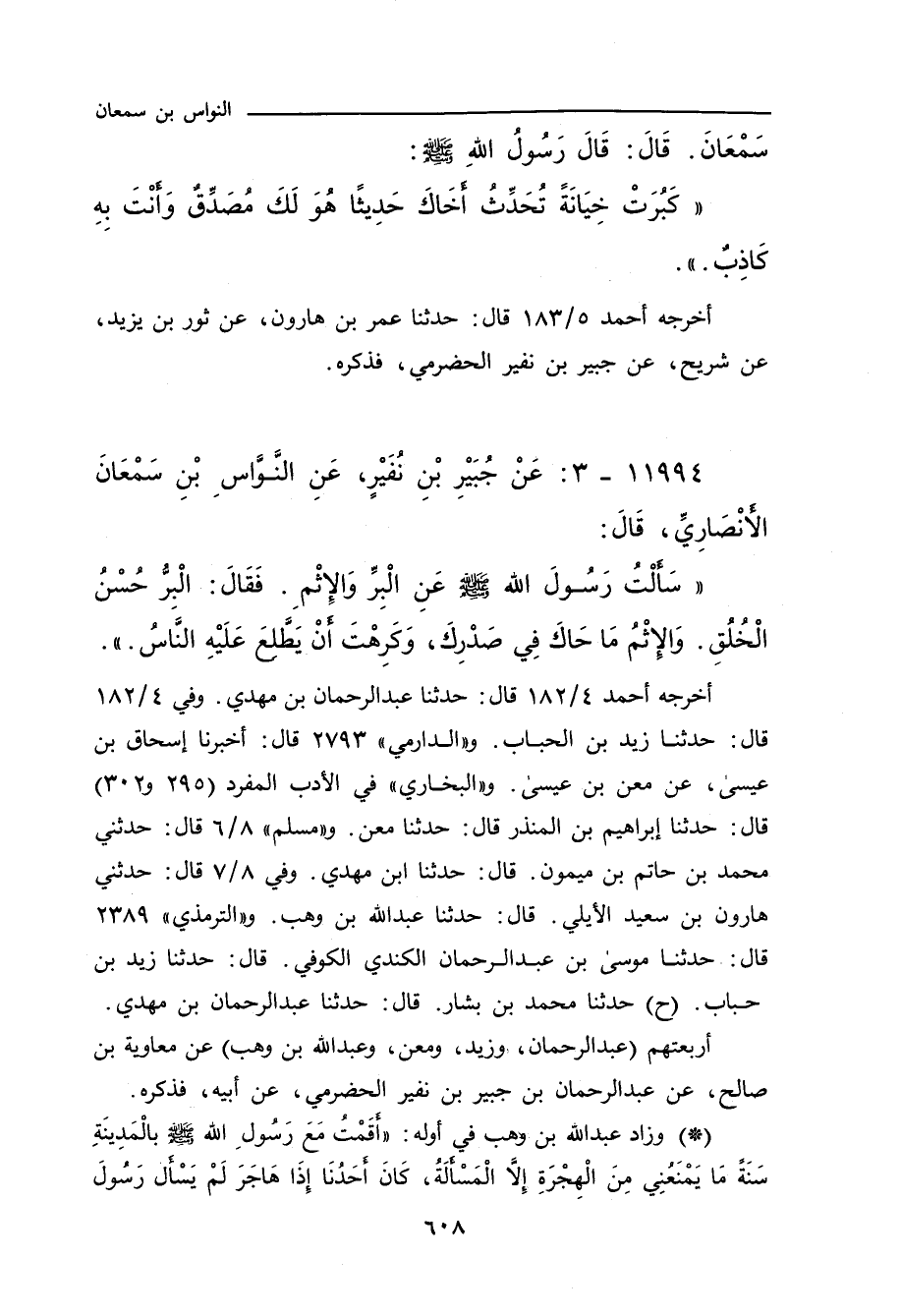 سَأَلْتُ رَسُولَ اللهِ صلى الله عليه وسلم عَنِ الْبِرِّ وَالإِثْمِ؟ فَقَالَ: الْبِرُّ حُسْنُ الْخُلُقِ، وَالإِثْمُ مَا حَاكَ فِي صَدْرِكَ، وَكَرِهْتَ أَنْ يَطَّلِعَ عَلَيْهِ النَّاسُ. م (٦٦٠٨)