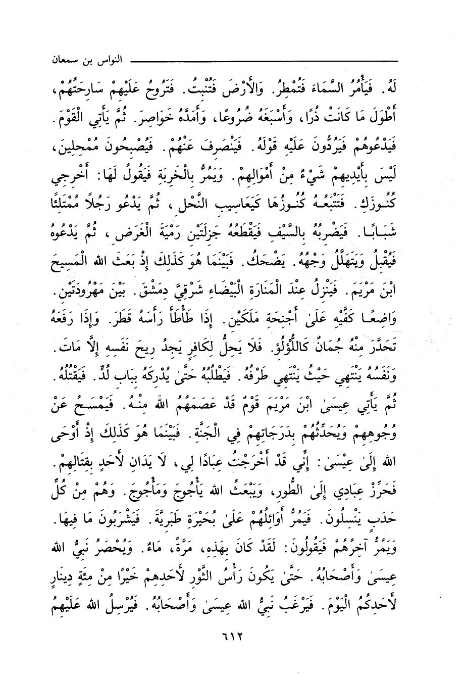 ذُرًا، وَأَسْبَغَهُ ضُرُوعًا، وَأَمَدَّهُ خَوَاصِرَ، ثُمَّ يَأْتِي الْقَوْمَ فَيَدْعُوهُمْ، فَيَرُدُّونَ عَلَيْهِ قَوْلَهُ، فَيَنْصَرِفُ عَنْهُمْ، فَيُصْبِحُونَ مُمْحِلِينَ، لَيْسَ بِأَيْدِيهِمْ شَيْءٌ مِنْ أَمْوَالِهِمْ، وَيَمُرُّ بِالْخَرِبَةِ فَيَقُولُ لَهَا: أَخْرِجِي كُنُوزَكِ، فَتَتْبَعُهُ كُنُوزُهَا كَيَعَاسِيبِ النَّحْلِ، ثُمَّ يَدْعُو رَجُلاً مُمْتَلِئًا شَبَابًا، فَيَضْرِبُهُ بِالسَّيْفِ، فَيَقْطَعُهُ جَزْلَتَيْنِ رَمْيَةَ الْغَرَضِ، ثُمَّ يَدْعُوهُ فَيُقْبِلُ وَيَتَهَلَّلُ وَجْهُهُ يَضْحَكُ، فَبَيْنَمَا هُوَ كَذَلِكَ، إِذْ بَعَثَ اللهُ الْمَسِيحَ ابْنَ مَرْيَمَ، فَيَنْزِلُ عِنْدَ الْمَنَارَةِ الْبَيْضَاءِ شَرْقِيَّ دِمَشْقَ، بَيْنَ مَهْرُودَتَيْنِ، وَاضِعًا كَفَّيْهِ عَلَى أَجْنِحَةِ مَلَكَيْنِ، إِذَا طَأْطَأَ رَأْسَهُ قَطَرَ، وَإِذَا رَفَعَهُ تَحَدَّرَ مِنْهُ جُمَانٌ كَاللُّؤْلُؤِ، فَلَا يَحِلُّ لِكَافِرٍ يَجِدُ رِيحَ نَفَسِهِ إِلَاّ مَاتَ، وَنَفَسُهُ يَنْتَهِي حَيْثُ يَنْتَهِي طَرْفُهُ، فَيَطْلُبُهُ حَتَّى يُدْرِكَهُ بِبَابِ لُدٍّ، فَيَقْتُلُهُ، ثُمَّ يَأْتِي عِيسَى ابْنَ مَرْيَمَ قَوْمٌ قَدْ عَصَمَهُمُ اللهُ مِنْهُ، فَيَمْسَحُ عَنْ وُجُوهِهِمْ، وَيُحَدِّثُهُمْ بِدَرَجَاتِهِمْ فِي الْجَنَّةِ، فَبَيْنَمَا هُوَ كَذَلِكَ، إِذْ أَوْحَى اللهُ إِلَى عِيسَى: إِنِّي قَدْ أَخْرَجْتُ عِبَادًا لِي، لَا يَدَانِ لأَحَدٍ بِقِتَالِهِمْ، فَحَرِّزْ عِبَادِي إِلَى الطُّورِ، وَيَبْعَثُ اللهُ يَأْجُوجَ وَمَأْجُوجَ، وَهُمْ مِنْ كُلِّ حَدَبٍ يَنْسِلُونَ، فَيَمُرُّ أَوَائِلُهُمْ عَلَى بُحَيْرَةِ طَبَرِيَّةَ، فَيَشْرَبُونَ مَا فِيهَا، وَيَمُرُّ آخِرُهُمْ فَيَقُولُونَ: لَقَدْ كَانَ بِهَذِهِ مَرَّةً مَاءٌ، وَيُحْصَرُ نَبِيُّ اللهِ عِيسَى