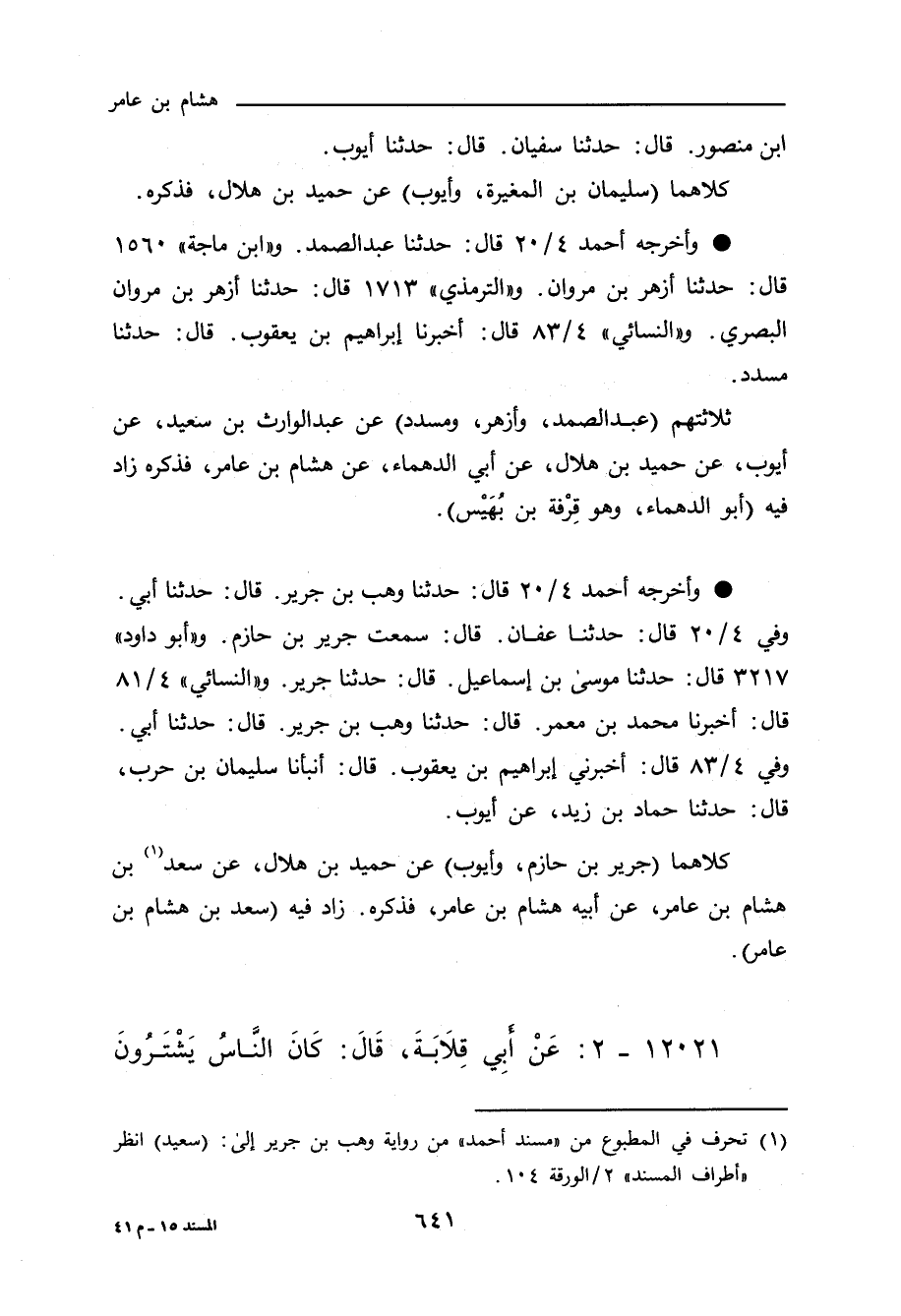 كلاهما (أَيُّوب، وجَرِير بن حازم) عن حُمَيْد بن هِلَال، عن سَعْد بن هِشَام بن عامر، فذكره. زاد فيه: سَعْد بن هِشَام بن عامر".