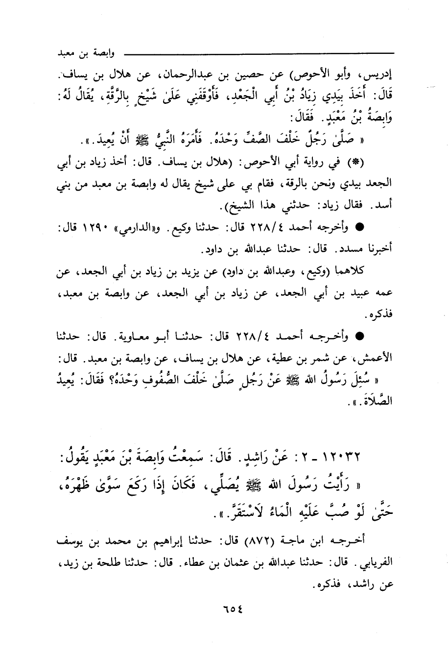 - وفي رواية: عَنْ هِلَالِ بْنِ يِسَافٍ، قَالَ: كُنْتُ أَنَا وَزِيَادُ بْنُ أَبِى الْجَعْدِ بِالرَّقَّةِ، فَأَخَذَ بِيَدِي زِيَادُ بْنُ أَبِي الْجَعْدِ، فَأَقَامَنِي عَلَى رَجُلٍ بِالرَّقَّةِ، فَقَالَ: زَعَمَ هَذَا أَنَّ رَسُولَ اللهِ صلى الله عليه وسلم رَأَى رَجُلاً يُصَلِّي خَلْفَ الصَّفِ وَحْدَهُ، فَأَمَرَهُ النَّبِيُّ صلى الله عليه وسلم أَنْ يُعِيدَ، وَاسْمُهُ وَابِصَةُ بْنُ مَعْبَدٍ. يد