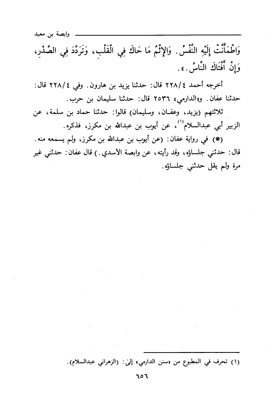 - وفي رواية: أَتَيْتُ رَسُولَ اللهِ صلى الله عليه وسلم، وَأَنَا أُرِيدُ أَنْ لَا أَدَعَ شَيْئًا مِنَ الْبِرِّ وَالإِثْمِ إِلَاّ سَأَلْتُهُ، فَأَتَيْتُهُ فِي عِصَابَةٍ مِنَ النَّاسِ يَسْتَفْتُونَهُ، فَجَعَلْتُ أَتَخَطَّاهُمْ، فَقَالُوا: إِلْيَكَ يَا وَابِصَةُ عَنْ رَسُولِ اللهِ صلى الله عليه وسلم، فَقُلْتُ: دَعُونِي أَدْنُوَ مِنْ رَسُولِ اللهِ صلى الله عليه وسلم، فَإِنَّهُ أَحَبُّ النَّاسِ إِلَيَّ أَنْ أَدْنُوَ مِنْهُ، قَالَ: دَعُوا وَابِصَةَ، ادْنُ يَا وَابِصَةُ، اسْتَفْتِ قَلْبَكَ، وَاسْتَفْتِ نَفْسَكَ، اسْتَفْتِ قَلْبَكَ، وَاسْتَفْتِ نَفْسَكَ، الْبِرُّ مَا اطْمَأَنَّتْ إِلَيْهِ النَّفْسُ، وَاطْمَأَنَّ إِلَيْهِ الْقَلْبُ، وَالإِثْمُ مَا حَاكَ فِى النَّفْسِ، وَتَرَدَّدَ فِي الصَّدْرِ، وَإِنْ أَفْتَاكَ النَّاسُ وَأَفْتَوْكَ، ثَلَاثًا. عل (١٥٨٦)