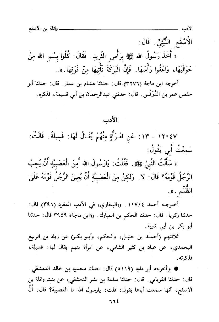 - وأخرجه أبو داود (٥١١٩) قال: حدَّثنا محمود بن خالد الدِّمَشْقِي، حدَّثنا الفِرْيَابِي، حدَّثنا سَلَمَة بن بِشْر الدِّمَشْقِي، عن بنت وَاثِلَة بن الأَسْقَع، أنها سَمِعَتْ أباها يقول: