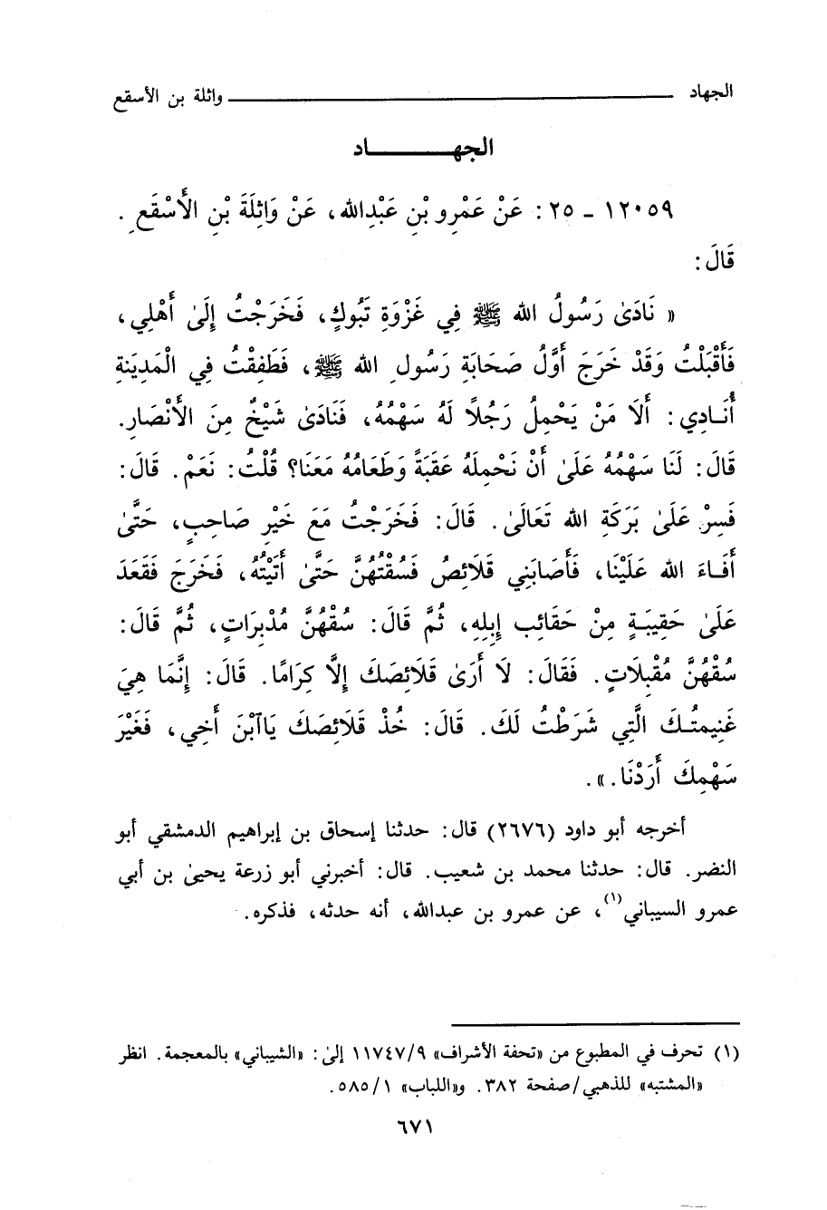 أخرجه أبو داود (٢٦٧٦) قال: حدَّثنا إِسْحَاق بن إبراهيم الدِّمَشْقِي، أبو النَّضْر، حدَّثنا مُحَمد بن شُعَيْب، أخبرني أبو زُرْعَة، يَحيى بن أَبي عَمْرو السَّيْبَانِي، عن عَمْرو بن عَبْد الله، أنه حدَّثه، فذكره.
