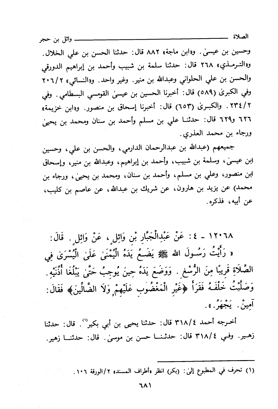 رَأَيْتُ رَسُولَ اللهِ صلى الله عليه وسلم يَضَعُ يَدَهُ الْيُمْنَى عَلَى الْيُسْرَى، فِي الصَّلَاةِ، قَرِيبًا مِنَ الرُّسْغِ، وَوَضَعَ يَدَهُ حِينَ يُوجِبُ حَتَّى يَبْلُغَا أُذُنَيْهِ، وَصَلَّيْتُ خَلْفَهُ فَقَرَأَ: "غَيْرِ الْمَغْضُوبِ عَلَيْهِمْ وَلَا الضَّالِّينَ) فَقَالَ: آمِينَ، يَجْهَرُ. حم