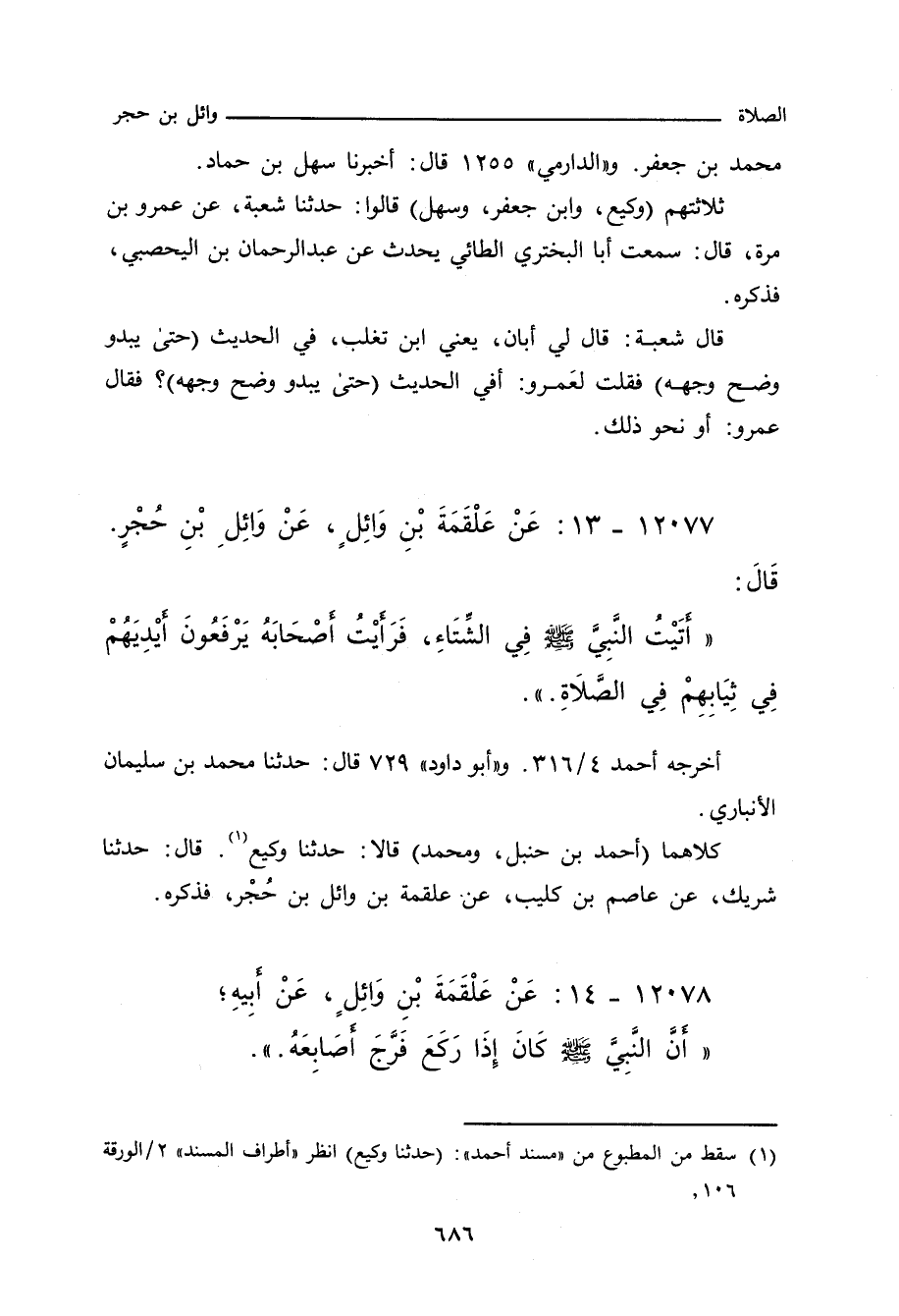 كلاهما (أحمد بن حَنْبَل، ومُحَمد) قالا: حدَّثنا وَكِيع، حدَّثنا شَرِيك، عن عاصم بن كُلَيْب، عن عَلْقَمَة بن وائل بن حُجْر، فذكره.