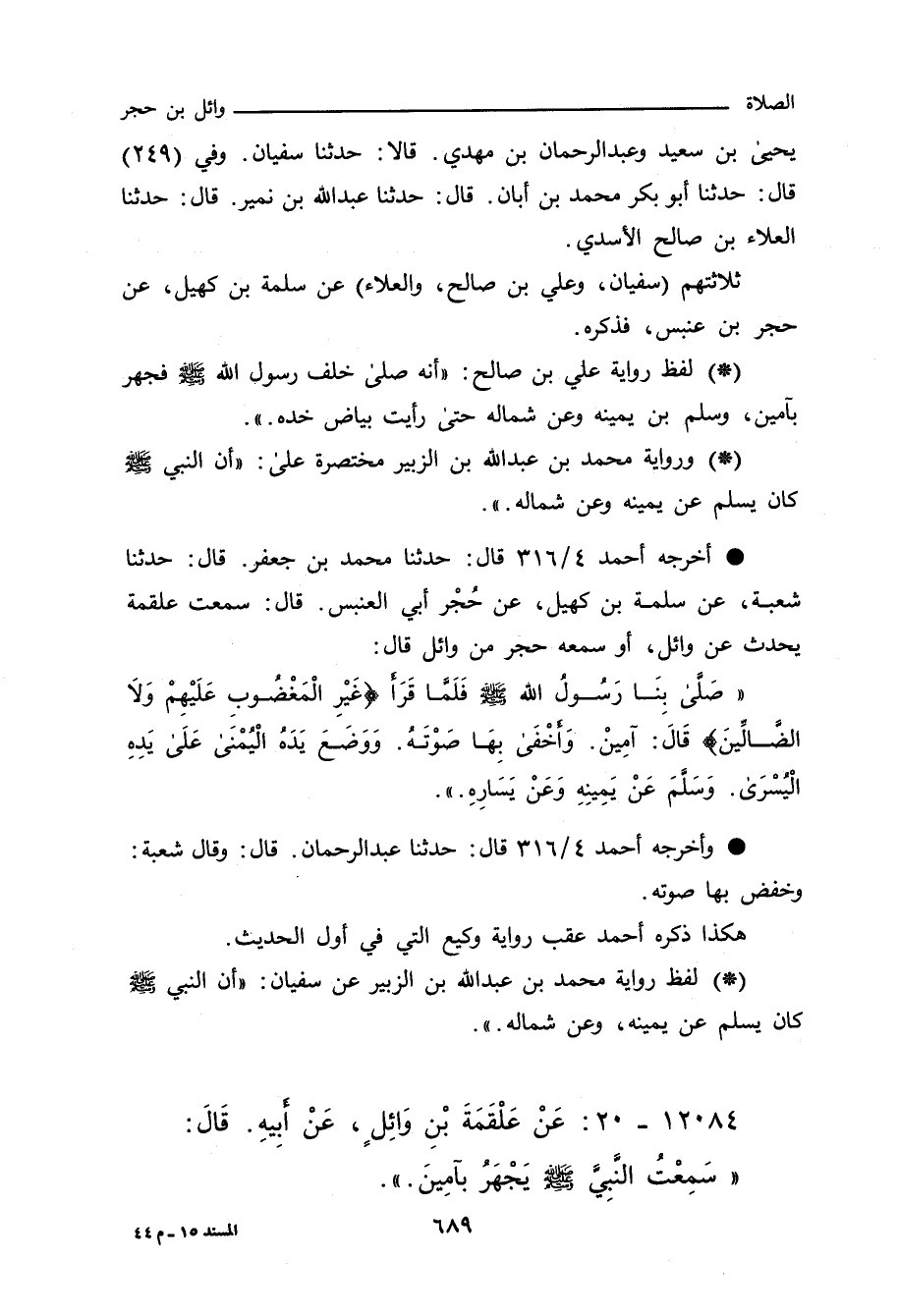 - أخرجه أحمد ٤/ ٣١٦ (١٩٠٥٩) قال: حدَّثنا مُحَمد بن جَعْفَر، حدَّثنا شُعْبة، عن سَلَمَة بن كُهَيْل، عن حُجْر أَبي العَنْبَس، قَالَ: سَمِعْتُ عَلْقَمَةَ يُحَدِّثُ، عَنْ وَائِلٍ، أَوْ سَمِعَهُ حُجْرٌ مِنْ وَائِلٍ، قَالَ: