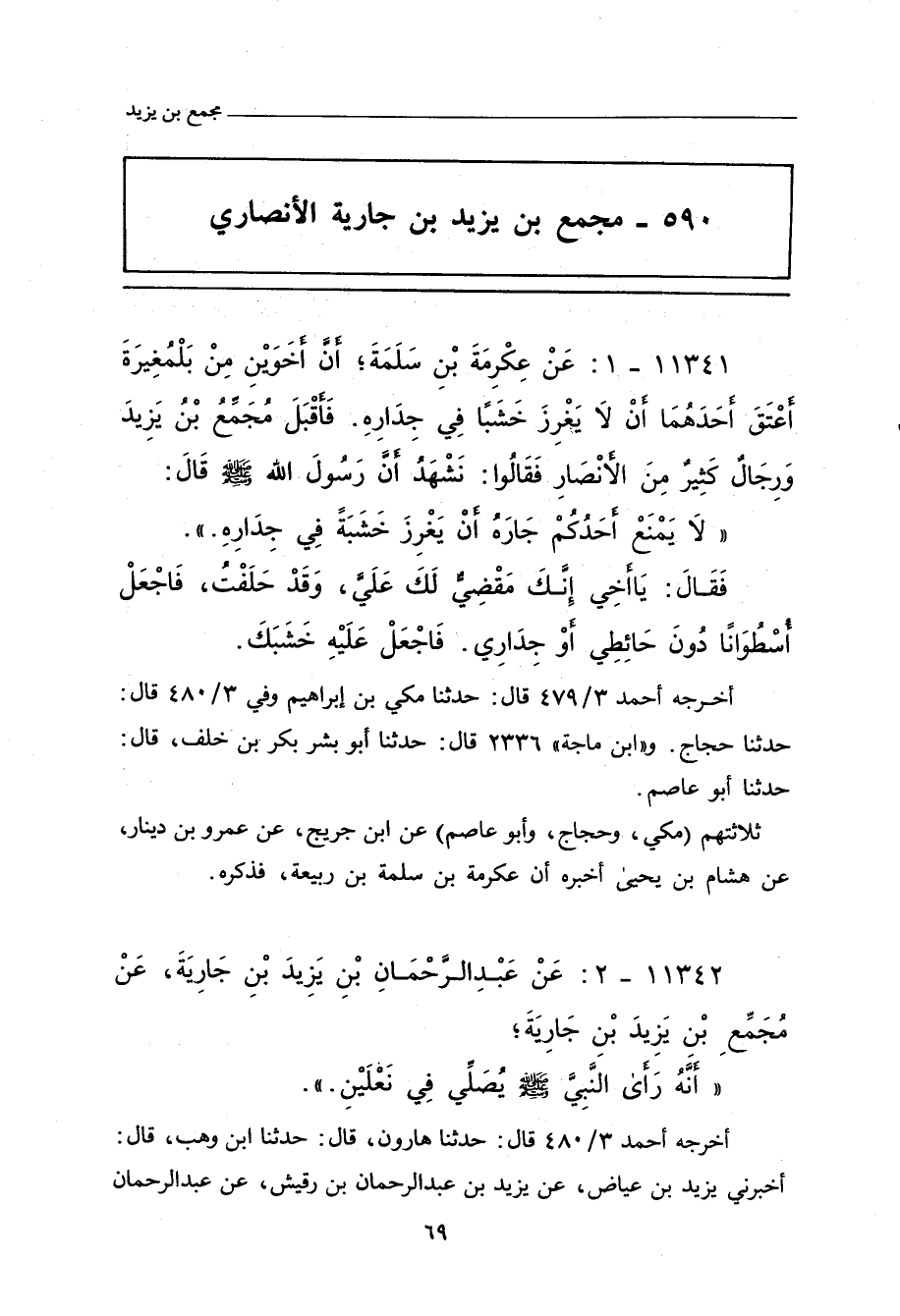 ١١٣٤١ - عَنْ عِكْرِمَةَ بْنِ سَلَمَةَ، أَنَّ أَخَوَيْنِ مِنْ بَلْمُغِيرَةَ أَعْتَقَ أَحَدُهُمَا أَنْ لَا يَغْرِزَ خَشَبًا فِي جِدَارِهِ، فَأَقْبَلَ مُجَمِّعُ بْنُ يَزِيدَ، وَرِجَالٌ كَثِيرٌ مِنَ الأَنْصَارِ، فَقَالُوا: نَشْهَدُ أَنَّ رَسُولَ اللهِ صلى الله عليه وسلم قَالَ: