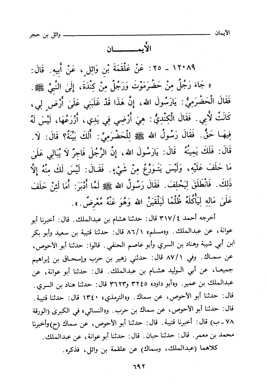 جَاءَ رَجُلٌ مِنْ حَضْرَمَوْتَ، وَرَجُلٌ مِنْ كِنْدَةَ، إِلَى النَّبِيِّ صلى الله عليه وسلم، فَقَالَ الْحَضْرَمِيُّ: يَا رَسُولَ اللهِ، إِنَّ هَذَا قَدْ غَلَبَنِي عَلَى أَرْضٍ لِي كَانَتْ لأَبِي، فَقَالَ الْكِنْدِيُّ: هِيَ أَرْضِي فِي يَدِي أَزْرَعُهَا، لَيْسَ لَهُ فِيهَا حَقٌّ، فَقَالَ رَسُولُ اللهِ صلى الله عليه وسلم لِلْحَضْرَمِيِّ: أَلَكَ بَيِّنَةٌ؟ قَالَ: لَا، قَالَ: فَلَكَ يَمِينُهُ، قَالَ: يَا رَسُولَ اللهِ، إِنَّ الرَّجُلَ فَاجِرٌ لَا يُبَالِي عَلَى مَا حَلَفَ عَلَيْهِ، وَلَيْسَ يَتَوَرَّعُ مِنْ شَيْءٍ، فَقَالَ: لَيْسَ لَكَ مِنْهُ إِلَاّ ذَلِكَ، فَانْطَلَقَ لِيَحْلِفَ، فَقَالَ رَسُولُ اللهِ صلى الله عليه وسلم لَمَّا أَدْبَرَ: أَمَا لَئِنْ حَلَفَ عَلَى مَالِهِ لِيَأْكُلَهُ ظُلْمًا، لَيَلْقَيَنَّ اللهَ وَهُوَ عَنْهُ مُعْرِضٌ. م (٢٧٥)