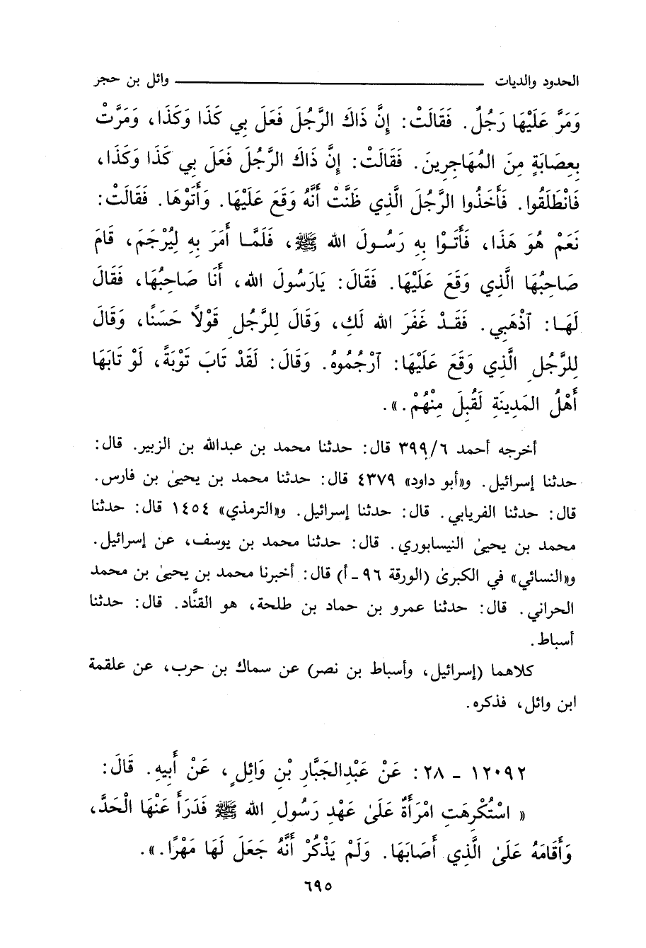 وَمَرَّ عَلَيْهَا رَجُلٌ، فَقَالَتْ: إِنَّ ذَاكَ الرَّجُلَ فَعَلَ بِي كَذَا وَكَذَا، وَمَرَّتْ بِعِصَابَةٍ مِنَ الْمُهَاجِرِينَ، فَقَالَتْ: إِنَّ ذَاكَ الرَّجُلَ فَعَلَ بِي كَذَا وَكَذَا، فَانْطَلَقُوا، فَأَخَذُوا الرَّجُلَ الَّذِي ظَنَّتْ أَنَّهُ وَقَعَ عَلَيْهَا، وَأَتَوْهَا، فَقَالَتْ: نَعَمْ هُوَ هَذَا، فَأَتَوْا بِهِ رَسُولَ اللهِ صلى الله عليه وسلم، فَلَمَّا أَمَرَ بِهِ لِيُرْجَمَ، قَامَ صَاحِبُهَا الَّذِي وَقَعَ عَلَيْهَا، فَقَالَ: يَا رَسُولَ اللهِ، أَنَا صَاحِبُهَا، فَقَالَ لَهَا: اذْهَبِي، فَقَدْ غَفَرَ اللهُ لَكِ، وَقَالَ لِلرَّجُلِ قَوْلاً حَسَنًا، وَقَالَ لِلرَّجُلِ الَّذِي وَقَعَ عَلَيْهَا: ارْجُمُوهُ، وَقَالَ: لَقَدْ تَابَ تَوْبَةً لَوْ تَابَهَا أَهْلُ الْمَدِينَةِ لَقُبِلَ مِنْهُمْ. ت