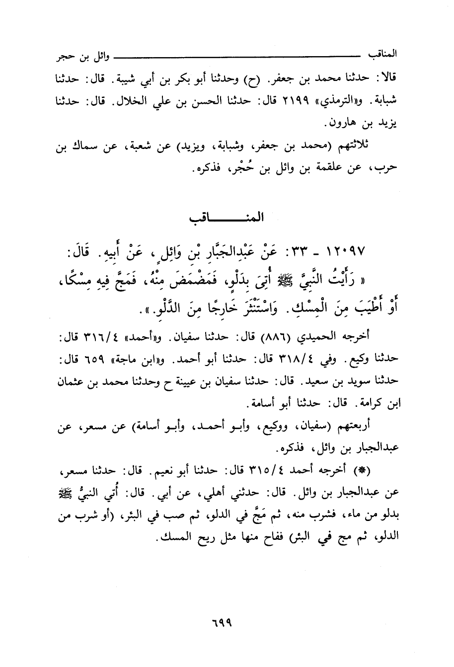 أربعتهم (سُفْيان، ووَكِيع، وأبو أحمد، وأبو أُسَامة) عن مِسْعَر، عن عَبْد الجبار بن وائل، فذكره.
