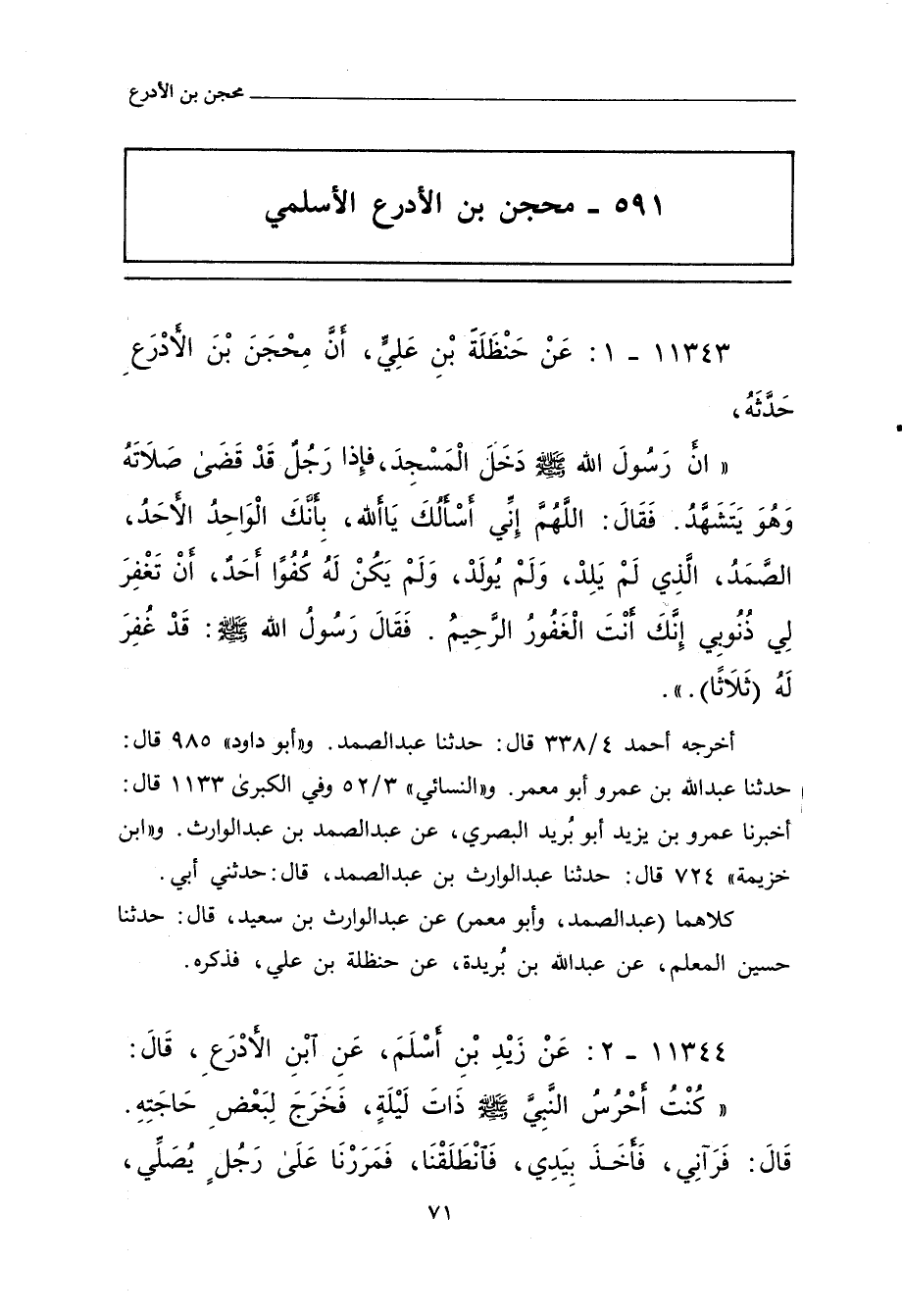 ١١٣٤٤ - عَنْ زَيْدِ بْنِ أَسْلَمَ عَنِ ابْنِ الأَدْرَعِ قَالَ كُنْتُ أَحْرُسُ النَّبِىَّ صلى الله عليه وسلم ذَاتَ لَيْلَةٍ فَخَرَجَ لِبَعْضِ حَاجَتِهِ - قَالَ - فَرَآنِى فَأَخَذَ بِيَدِى فَانْطَلَقْنَا فَمَرَرْنَا عَلَى رَجُلٍ يُصَلِّى