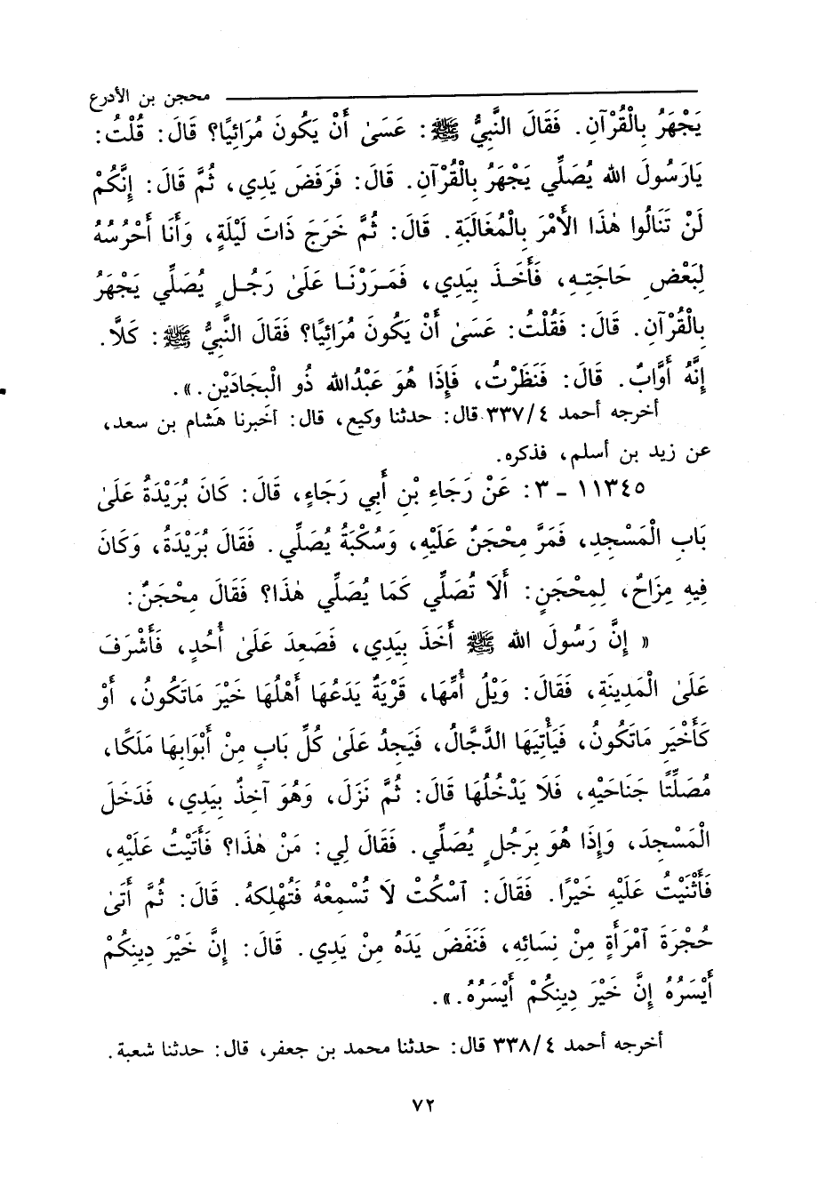 يَجْهَرُ بِالْقُرْآنِ فَقَالَ النَّبِىُّ صلى الله عليه وسلم «عَسَى أَنْ يَكُونَ مُرَائِيًا». قَالَ قُلْتُ يَا رَسُولَ اللَّهِ يُصَلِّى يَجْهَرُ بِالْقُرْآنِ - قَالَ - فَرَفَضَ يَدِى ثُمَّ قَالَ «إِنَّكُمْ لَنْ تَنَالُوا هَذَا الأَمْرَ بِالْمُغَالَبَةِ». قَالَ ثُمَّ خَرَجَ ذَاتَ لَيْلَةٍ وَأَنَا أَحْرُسُهُ لِبَعْضِ حَاجَتِهِ فَأَخَذَ بِيَدِى فَمَرَرْنَا عَلَى رَجُلٍ يُصَلِّى بِالْقُرْآنِ - قَالَ - فَقُلْتُ عَسَى أَنْ يَكُونَ مُرَائِيًا. فَقَالَ النَّبِىُّ صلى الله عليه وسلم «كَلَاّ إِنَّهُ أَوَّابٌ». قَالَ فَنَظَرْتُ فَإِذَا هُوَ عَبْدُ اللَّهِ ذُو الْبِجَادَيْنِ.