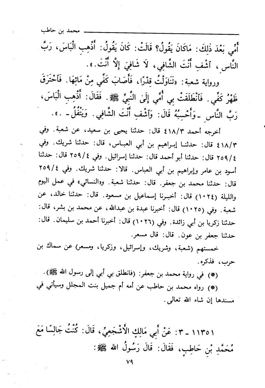 - رواه مُحَمد بن حاطب، عن أُمِّه أُم جَمِيل بنت المُجَلَّل، وسيأتي في مسندها، إن شاء الله تعالى.