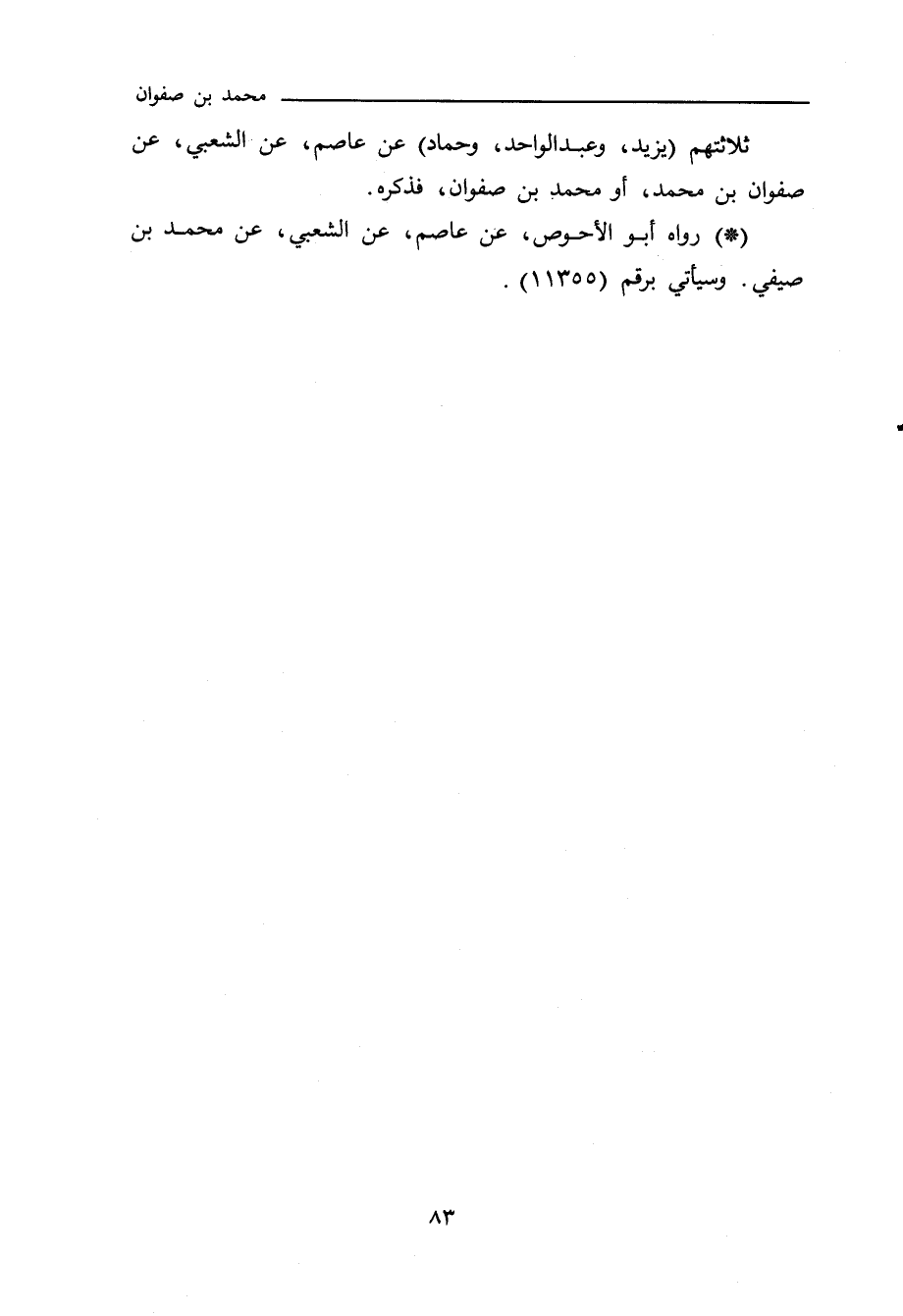 ثلاثهم (يَزِيد، وعَبْد الواحد، وحَمَّاد) عن عاصم، عن الشَّعْبِي، عَنْ مُحَمَّدِ بْنِ صَفْوَانَ، أَوْ صَفْوَانَ بْنِ مُحَمَّدٍ، قَالَ: