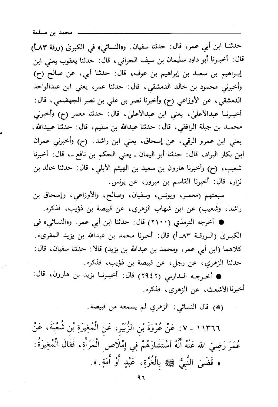 حدَّثنا ابن أَبي عُمَر، حدَّثنا سُفْيان. و"النَّسائي" في "الكبرى"٦٣٠٥ قال: أَخْبَرنا أبو داود، سُلَيْمان بن سَيْف الحَرَّانِي، قال: حدَّثنا يَعْقُوب، يَعْنِي ابن إبراهيم بن سَعْد بن إبراهيم بن عَوْف، قال: حدَّثنا أَبي، عن صالح. وفي (٦٣٠٦) قال: أخبرني محمود بن خالد الدِّمَشْقِي، قال: حدَّثنا عُمَر، يَعْنِي ابن عَبْد الواحد الدِّمَشْقِي، عن الأَوْزَاعِي. وفي (٦٣٠٧) قال: أَخْبَرنا نَصْر بن علي بن نَصْر الجَهْضَمِي، قال: أَخْبَرنا عَبْد الأَعْلَى، يَعْنِي ابن عَبْد الأَعْلَى، قال: حدَّثنا مَعْمَر. وفي (٦٣٠٨) قال: أخبرني مُحَمد بن جَبَلَة الرَّافِقِي، قال: حدَّثنا عَبْد الله بن سُلَيْم، قال: حدَّثنا عُبَيْد الله، يَعْنِي ابن عَمْرو الرَّقِّي، عن إِسْحَاق، يَعْنِي ابن راشد. وفي (٦٣٠٩) قال: أخبرني عِمْران بن بَكَّار البَرَّاد، قال: حدَّثنا أبو اليَمَان، يَعْنِي الحَكَم بن نافع، قال: أَخْبَرنا شُعَيْب. وفي (٦٣١٠) قال: أَخْبَرنا هارون بن سَعِيد بن الهَيْثَم الأَيْلِي، قال: حدَّثنا خالد بن نِزَار، قال: أَخْبَرنا القاسم بن مَبْرُور، عن يُونُس.