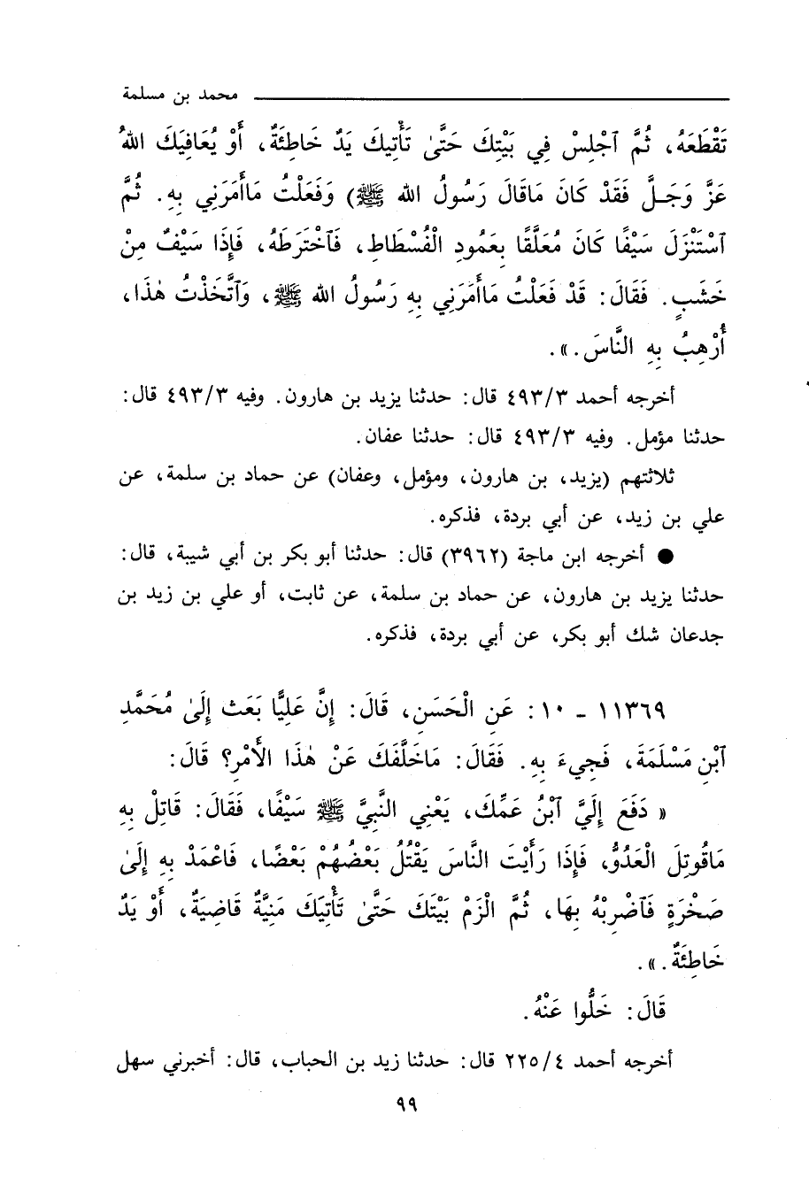 - أخرجه ابن ماجة (٣٩٦٢) قال: حدَّثنا أبو بَكْر بن أَبي شَيْبَة، حدَّثنا يَزِيد بن هارون، عن حَمَّاد بن سَلَمَة، عن ثابت، أو علي بن زَيْد بن جُدْعَان - شك أبو بَكْر - عَنْ أَبِي بُرْدَةَ، قَالَ: دَخَلْتُ عَلَى مُحَمَّدِ بْنِ مَسْلَمَةَ، فَقَالَ: إِنَّ رَسُولَ اللهِ صلى الله عليه وسلم قَالَ: