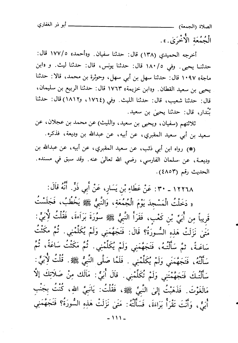 دَخَلْتُ الْمَسْجِدَ يَوْمَ الْجُمُعَةِ وَالنَّبِيُّ صلى الله عليه وسلم يَخْطُبُ، فَجَلَسْتُ قَرِيبًا مِنْ أُبَيِّ بْنِ كَعْبٍ، فَقَرَأَ النَّبِيُّ صلى الله عليه وسلم سُورَةَ بَرَاءَةَ، فَقُلْتُ لأُبَيٍّ: مَتَى نَزَلَتْ هَذِهِ السُّورَةُ؟ قَالَ: فَتَجَهَّمَنِي وَلَمْ يُكَلِّمْنِي، ثُمَّ مَكَثْتُ سَاعَةً، ثُمَّ سَأَلْتُهُ، فَتَجَهَّمَنِي وَلَمْ يُكَلِّمْنِي، ثُمَّ مَكَثْتُ سَاعَةً، ثُمَّ سَأَلْتُهُ، فَتَجَهَّمَنَي وَلَمْ يُكَلِّمْنِي، فَلَمَّا صَلَّى النَّبِيُّ صلى الله عليه وسلم، قُلْتُ لأُبَيٍّ: سَأَلْتُكَ فَتَجَهَّمْتَنِي وَلَمْ تُكَلِّمْنِي، قاَلَ أُبَيٌّ: مَا لَكَ مِنْ صَلَاتِكَ إِلَاّ مَا لَغَوْتَ، فَذَهَبْتُ إِلَى النَّبِيِّ صلى الله عليه وسلم، فَقُلْتُ: يَا نَبِيَّ اللهِ، كُنْتُ بِجَنْبِ أُبَيٍّ، وَأَنْتَ تَقْرَأُ بَرَاءَةَ، فَسَأَلْتُهُ: مَتَى نَزَلَتْ هَذِهِ السُّورَةُ، فَتَجَهَّمَنِي