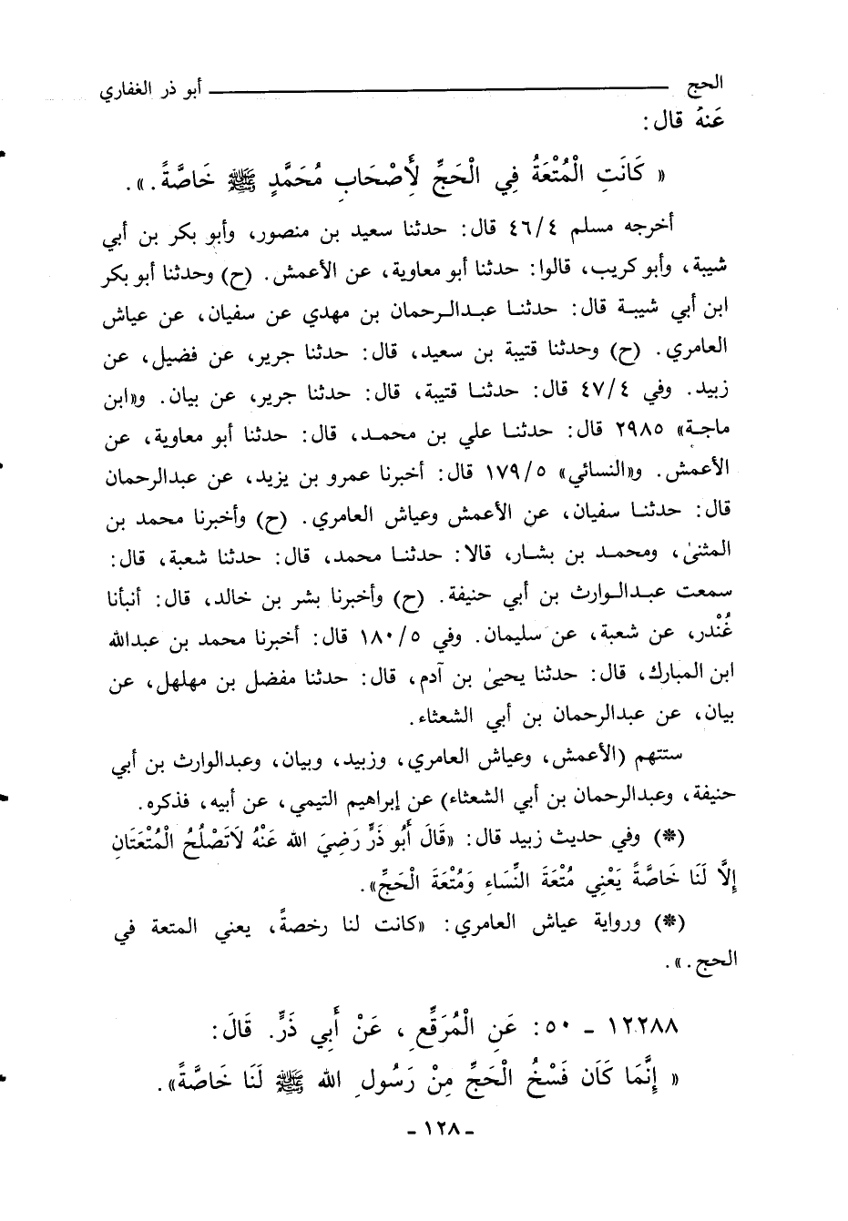 - وفي رواية: قَالَ أَبُو ذَرٍّ، رَضِيَ اللَّهُ عَنْهُ: لَا تَصْلُحُ الْمُتْعَتَانِ إِلَاّ لَنَا خَاصَّةً، يَعْنِي مُتْعَةَ النِّسَاءِ، وَمُتْعَةَ الْحَجِّ.) ".