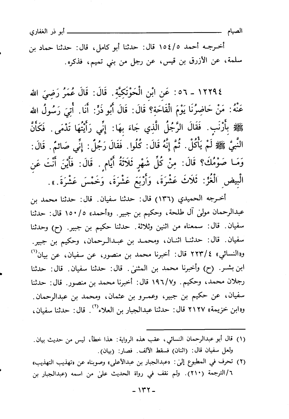 مَنْ حَاضِرُنَا يَوْمَ الْقَاحَةِ، إِذْ أُتِيَ النَّبِيُّ صلى الله عليه وسلم بِأَرْنَبٍ؟ فَقَالَ أَبُو ذَرٍّ: أَنَا؛ أَتَى أَعْرَابِيٌّ النَّبِيَّ صلى الله عليه وسلم بِأَرْنَبٍ، فَقَالَ: يَا رَسُولَ اللهِ، إِنِّي رَأَيْتُهَا تَدْمَى، قَالَ: فَكَفَّ عَنْهُ النَّبِيُّ صلى الله عليه وسلم، فَلَمْ يَأْكُلْ، وَأَمَرَ أَصْحَابَهُ أَنْ يَأْكُلُوا، وَاعْتَزَلَ الأَعْرَابِيُّ فَلَمْ يَطْعَمْ، فَقَالَ: إِنِّي صَائِمٌ، فَقَالَ النَّبِيُّ صلى الله عليه وسلم: وَمَا صَوْمُكَ؟ قَالَ: ثَلَاثٌ مِنْ كُلِّ شَهْرٍ، فَقَالَ: أَيْنَ أَنْتَ عَنِ الْبِيضِ الْغُرِّ: ثَلَاثَ عَشْرَةَ، وَأَرْبَعَ عَشْرَةَ، وَخَمْسَ عَشْرَةَ.