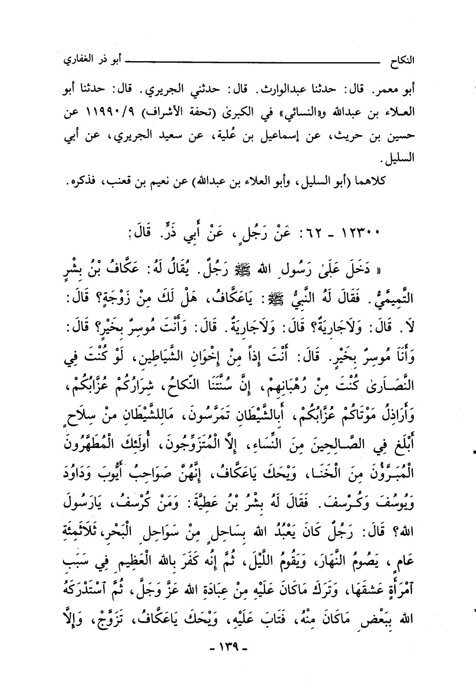 دَخَلَ عَلَى رَسُولِ اللهِ صلى الله عليه وسلم رَجُلٌ، يُقَالُ لَهُ: عَكَّافُ بْنُ بِشْرٍ التَّمِيمِيُّ، فَقَالَ لَهُ النَّبِيُّ صلى الله عليه وسلم: يَا عَكَّافُ، هَلْ لَكَ مِنْ زَوْجَةٍ؟ قَالَ: لَا، قَالَ: وَلَا جَارِيَةٍ؟ قَالَ: وَلَا جَارِيَةَ، قَالَ: وَأَنْتَ مُوسِرٌ بِخَيْرٍ؟ قَالَ: وَأَنَا مُوسِرٌ بِخَيْرٍ، قَالَ: أَنْتَ إِذًا مِنْ إِخْوَانِ الشَّيَاطِينِ، وَلَوْ كُنْتَ فِي النَّصَارَى كُنْتَ مِنْ رُهْبَانِهِمْ، إِنَّ سُنَّتَنَا النِّكَاحُ، شِرَارُكُمْ عُزَّابُكُمْ، وَأَرَاذِلُ مَوْتَاكُمْ عُزَّابُكُمْ، أَبِالشَّيْطَانِ تَمَرَّسُونَ، مَا لِلشَّيْطَانِ مِنْ سِلَاحٍ أَبْلَغُ فِي الصَّالِحِينَ مِنَ النِّسَاءِ، إِلَاّ الْمُتَزَوِّجُونَ، أُولَئِكَ الْمُطَهَّرُونَ الْمُبَرَّءُونَ مِنَ الْخَنَا، وَيْحَكَ يَا عَكَّافُ، إِنَّهُنَّ صَوَاحِبُ أَيُّوبَ وَدَاوُدَ وَيُوسُفَ وَكُرْسُفَ، فَقَالَ لَهُ بِشْرُ بْنُ عَطِيَّةَ: وَمَنْ كُرْسُفُ يَا رَسُولَ اللهِ؟ قَالَ: رَجُلٌ كَانَ يَعْبُدُ اللهَ بِسَاحِلٍ مِنْ سَوَاحِلِ الْبَحْرِ ثَلَاثَمِئَةِ عَامٍ، يَصُومُ النَّهَارَ، وَيَقُومُ اللَّيْلَ، ثُمَّ إِنَّهُ كَفَرَ بِاللهِ الْعَظِيمِ فِي سَبَبِ امْرَأَةٍ عَشِقَهَا وَتَرَكَ مَا كَانَ عَلَيْهِ مِنْ عِبَادَةِ اللهِ، عَزَّ وَجَلَّ، ثُمَّ اسْتَدْرَكَهُ اللَّهُ بِبَعْضِ مَا كَانَ مِنْهُ، فَتَابَ عَلَيْهِ، وَيْحَكَ يَا عَكَّافُ تَزَوَّجْ، وَإِلَاّ