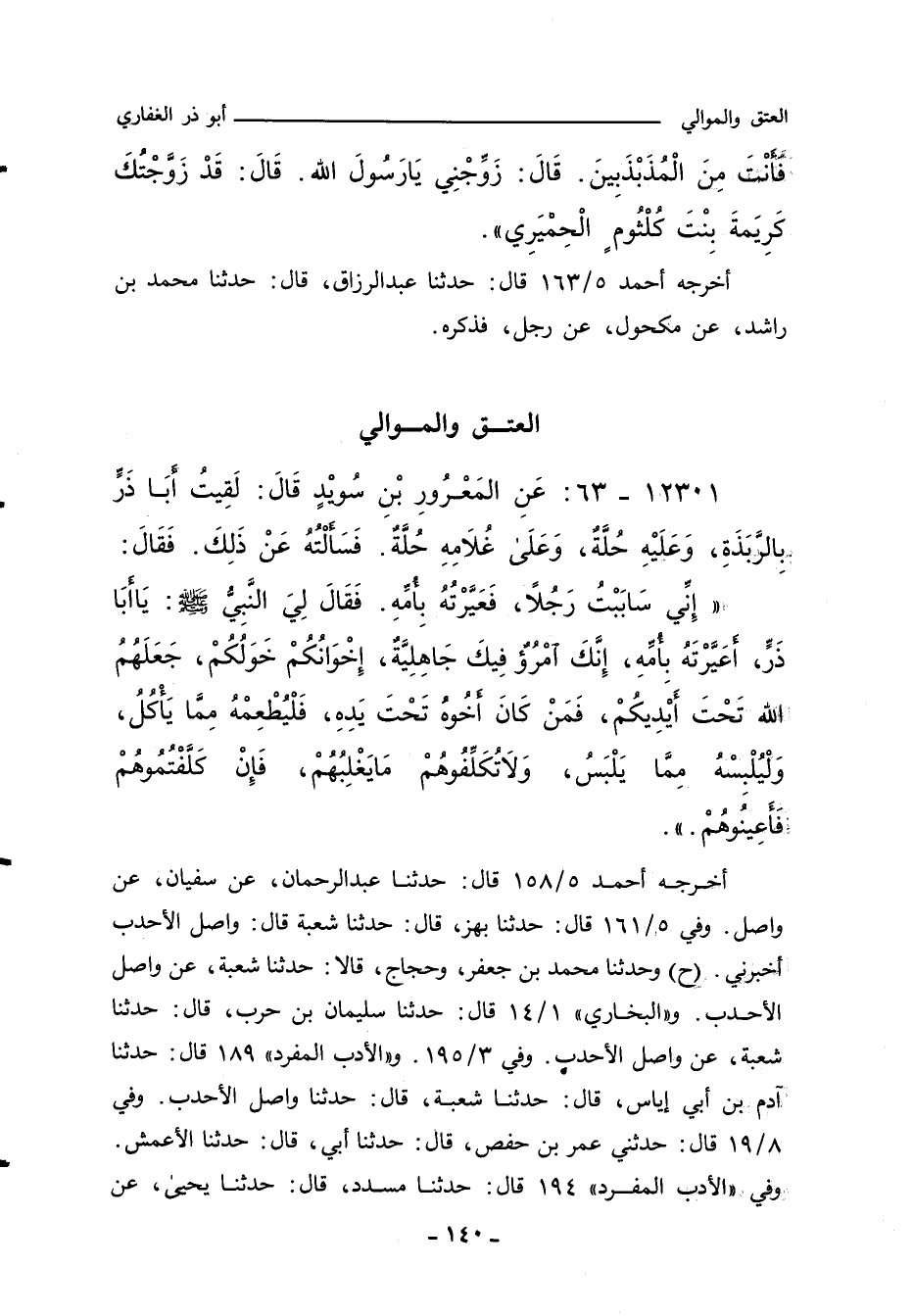١٢٣٠١ - ٦٣: عَنِ الْمَعْرُورِ بْنَ سُوَيْدٍ، قَالَ: لَقِيتُ أَبَا ذَرٍّ بِالرَّبَذَةِ، وَعَلَيْهِ حُلَّةٌ، وَعَلَى غُلَامِهِ حُلَّةٌ، فَسَأَلْتُهُ عَنْ ذَلِكَ، فَقَالَ: