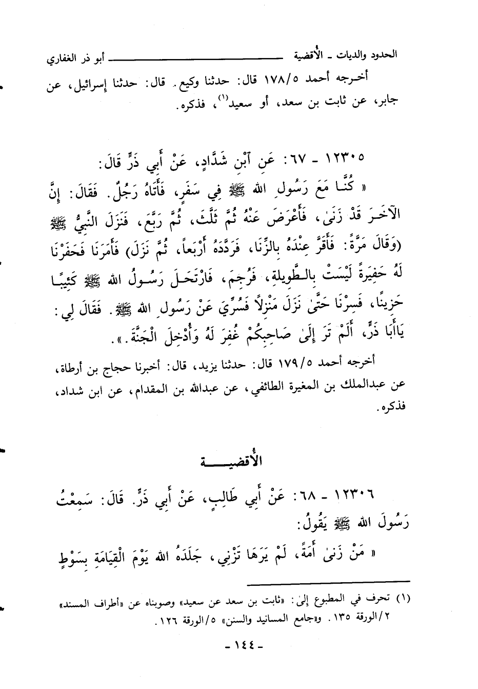 كُنَّا مَعَ رَسُولِ اللهِ صلى الله عليه وسلم فِي سَفَرٍ، فَأَتَاهُ رَجُلٌ، فَقَالَ: إِنَّ الآخِرَ قَدْ زَنَى، فَأَعْرَضَ عَنْهُ، ثُمَّ ثَلَّثَ، ثُمَّ رَبَّعَ، فَنَزَلَ النَّبِيُّ صلى الله عليه وسلم، وَقَالَ مَرَّةً: فَأَقَرَّ عِنْدَهُ بِالزِّنَا، فَرَدَّدَهُ أَرْبَعًا، ثُمَّ نَزَلَ، فَأَمَرَنَا فَحَفَرْنَا لَهُ حُفَيْرَةً لَيْسَتْ بِالطَّوِيلَةِ، فَرُجِمَ، فَارْتَحَلَ رَسُولُ اللهِ صلى الله عليه وسلم كَئِيبًا حَزِينًا، فَسِرْنَا حَتَّى نَزَلَ مَنْزِلاً، فَسُرِّيَ عَنْ رَسُولِ اللهِ صلى الله عليه وسلم، فَقَالَ لِي: يَا أَبَا ذَرٍّ، أَلَمْ تَرَ إِلَى صَاحِبِكُمْ غُفِرَ لَهُ وَأُدْخِلَ الْجَنَّةَ.