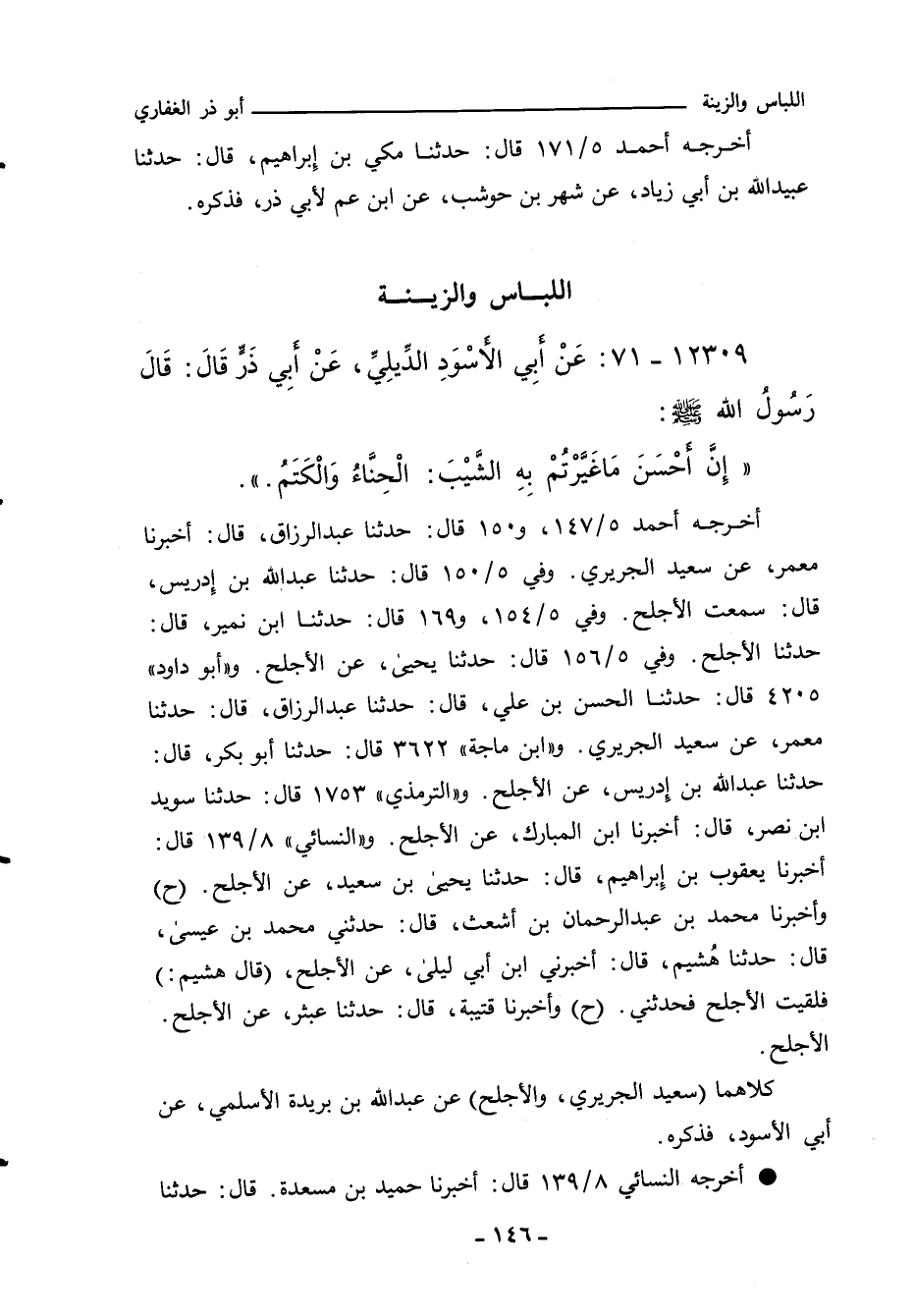 أخرجه عبد الرَّزَّاق (٢٠١٧٤) قال: أَخْبَرنا معمر، عن سعيد الجريري. و"ابن أبي شَيبة" ٨/ ٢٤٤ (٢٤٩٩١) قال: حدَّثنا ابن إدريس، عن الأجلح. و"أحمد" ٥/ ١٤٧ (٢١٦٣٢) و ٥/ ١٥٠ (٢١٦٦٤) قال: حدَّثنا عبد الرَّزَّاق، أنبأنا معمر، عن سعيد الجريري. وفي ٥/ ١٥٠ (٢١٦٦٣) قال: حدَّثنا عبد الله بن إِدريس، قال: سمعت الأجلح. وفي ٥/ ١٥٤ (٢١٦٩٠)، و ٥/ ١٦٩ (٢١٨٢١) قال: حدَّثنا ابن نمير، حدَّثنا الأجلح. وفي ٥/ ١٥٦ (٢١٧١٤) قال: حدَّثنا يحيى، عن الأجلح. و"أبو داود" ٤٢٠٥ قال: حدَّثنا الحسن بن علي، حدَّثنا عبد الرَّزَّاق، حدثنا معمر، عن سعيد الجريري. و"ابن ماجة" ٣٦٢٢ قال: حدَّثنا أبو بكر، حدَّثنا عبد الله بن إِدريس، عن الأجلح. و"التِّرمِذي" ١٧٥٣ قال: حدَّثنا سويد بن نصر، أَخْبَرنا ابن المبارك، عن الأجلح. و"النَّسائي" ٨/ ١٣٩، وفي "الكبرى" ٩٢٩٧ قال: أَخْبَرنا يعقوب بن إِبراهيم، قال: حدَّثنا يحيى بن سعيد، عن الأجلح. وفي ٨/ ١٣٩، وفي "الكبرى" ٩٢٩٩ قال: أَخْبَرنا محمد بن عبد الرَّحْمان بن أشعث، قال: حدثني محمد بن عيسى، قال: حدَّثنا هُشيم، قال: أخبرني ابن أبي ليلى، عن الأجلح، فلقيت الأجلح فحدثني. وفي ٨/ ١٣٩، وفي "الكبرى" ٩٢٩٨ قال: أَخْبَرنا قتيبة، قال: حدَّثنا عبثر، عن الأجلح. و"ابن حِبان" ٥٤٧٤ قال: أَخْبَرنا عمر بن محمد، قال: حدَّثنا محمد بن عبد الملك بن زنجويه، قال: حدَّثنا عبد الرزاق، حدثنا معمر بن راشد، عن الجريري.