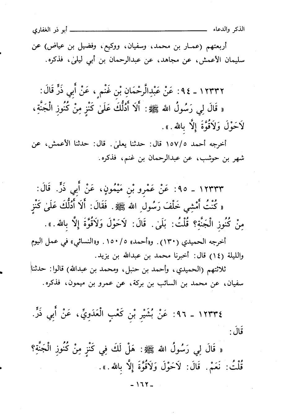 كُنْتُ أَمْشِي خَلْفَ رَسُولِ اللهِ صلى الله عليه وسلم، فَقَالَ: أَلَا أَدُلُّكَ عَلَى كَنْزٍ مِنْ كُنُوزِ الْجَنَّةِ؟ قُلْتُ: بَلَى، قَالَ: لَا حَوْلَ وَلَا قُوَّةَ إِلَاّ بِاللهِ.