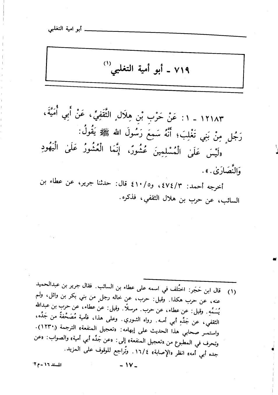 لَيْسَ عَلَى الْمُسْلِمِينَ عُشُورٌ إِنَّمَا الْعُشُورُ عَلَى الْيَهُودِ وَالنَّصَارَى.