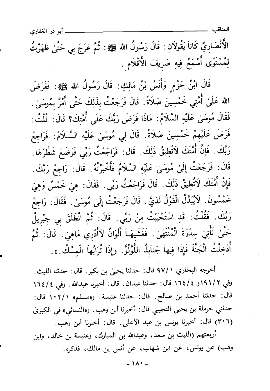 الأَنْصَارِيَّ كَانَا يَقُولَانِ: قَالَ رَسُولُ اللهِ صلى الله عليه وسلم: ثُمَّ عَرَجَ بِي حَتَّى ظَهَرْتُ لِمُسْتَوًى أَسْمَعُ فِيهِ صَرِيفَ الأَقْلَامِ.