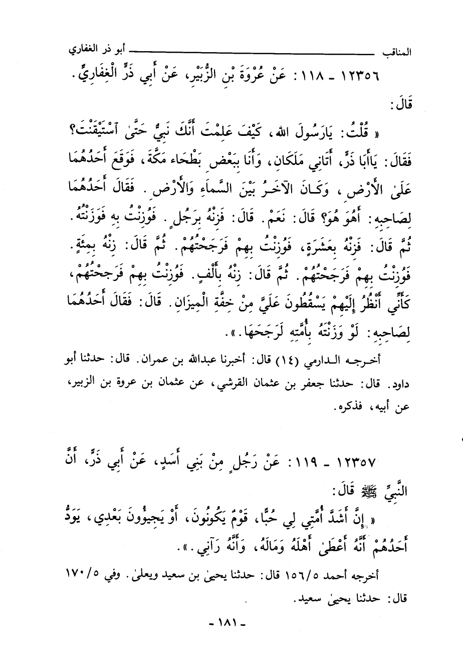 قُلْتُ: يَا رَسُولَ اللهِ، كَيْفَ عَلِمْتَ أَنَّكَ نَبِيٌّ حَتَّى اسْتَيْقَنْتَ؟ فَقَالَ: يَا أَبَا ذَرٍّ، أَتَانِي مَلَكَانِ وَأَنَا بِبَعْضِ بَطْحَاءِ مَكَّةَ، فَوَقَعَ أَحَدُهُمَا إِلَى الأَرْضِ، وَكَانَ الآخَرُ بَيْنَ السَّمَاءِ وَالأَرْضِ، فَقَالَ أَحَدُهُمَا لِصَاحِبِهِ: أَهُوَ هُوَ؟ قَالَ: نَعَمْ، قَالَ: فَزِنْهُ بِرَجُلٍ، فَوُزِنْتُ بِهِ فَوَزَنْتُهُ، ثُمَّ قَالَ: زِنْهُ بِعَشَرَةٍ، فَوُزِنْتُ بِهِمْ فَرَجَحْتُهُمْ، ثُمَّ قَالَ: زِنْهُ بِمِئَةٍ، فَوُزِنْتُ بِهِمْ فَرَجَحْتُهُمْ، ثُمَّ قَالَ: زِنْهُ بِأَلْفٍ، فَوُزِنْتُ بِهِمْ فَرَجَحْتُهُمْ، كَأَنِّي أَنْظُرُ إِلَيْهِمْ يَنْتَثِرُونَ عَلَيَّ مِنْ خِفَّةِ الْمِيزَانِ، قَالَ: فَقَالَ أَحَدُهُمَا لِصَاحِبِهِ: لَوْ وَزَنْتَهُ بِأُمَّتِهِ لَرَجَحَهَا.