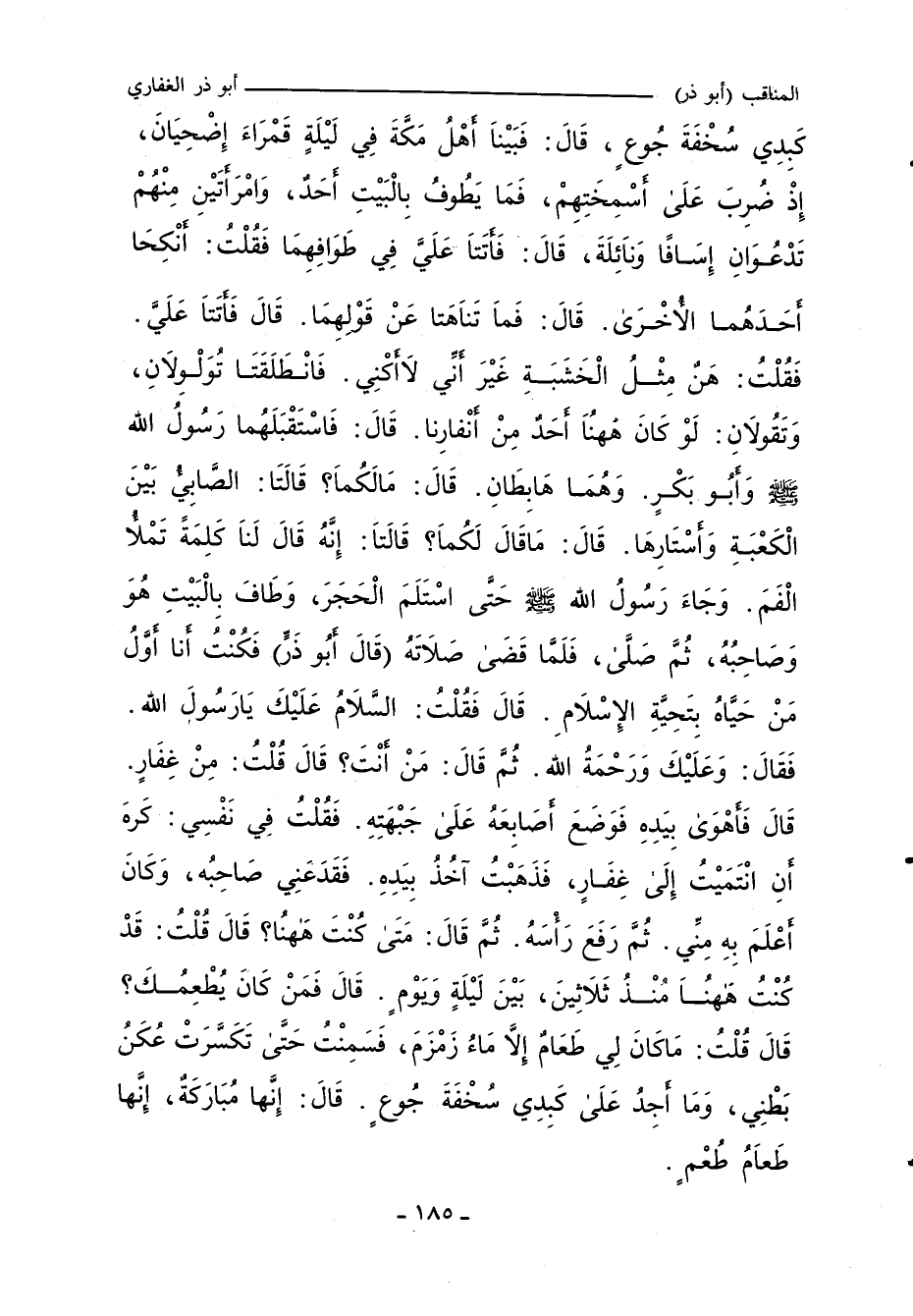 قَالَ: مَا قَالَ لَكُمَا؟ قَالَتَا: إِنَّهُ قَالَ لَنَا كَلِمَةً تَمْلأُ الْفَمَ، وَجَاءَ رَسُولُ اللهِ صلى الله عليه وسلم حَتَّى اسْتَلَمَ الْحَجَرَ، وَطَافَ بِالْبَيْتِ هُوَ وَصَاحِبُهُ، ثُمَّ صَلَّى، فَلَمَّا قَضَى صَلَاتَهُ، قَالَ أَبُو ذَرٍّ: فَكُنْتُ أَنَا أَوَّلُ مَنْ حَيَّاهُ بِتَحِيَّةِ الإِسْلَامِ، قَالَ: فَقُلْتُ: السَّلَامُ عَلَيْكَ يَا رَسُولَ اللهِ، فَقَالَ: وَعَلَيْكَ وَرَحْمَةُ اللهِ، ثُمَّ قَالَ: مَنْ أَنْتَ؟ قَالَ: قُلْتُ: مِنْ غِفَارٍ، قَالَ: فَأَهْوَى بِيَدِهِ، فَوَضَعَ أَصَابِعَهُ عَلَى جَبْهَتِهِ، فَقُلْتُ فِي نَفْسِي: كَرِهَ أَنِ انْتَمَيْتُ إِلَى غِفَارٍ، فَذَهَبْتُ آخُذُ بِيَدِهِ، فَقَدَعَنِي صَاحِبُهُ، وَكَانَ أَعْلَمَ بِهِ مِنِّي، ثُمَّ رَفَعَ رَأْسَهُ، ثُمَّ قَالَ: مَتَى كُنْتَ هَا هُنَا؟ قَالَ: قُلْتُ: قَدْ كُنْتُ هَا هُنَا مُنْذُ ثَلَاثِينَ بَيْنَ لَيْلَةٍ وَيَوْمٍ، قَالَ: فَمَنْ كَانَ يُطْعِمُكَ، قَالَ: قُلْتُ: مَا كَانَ لِي طَعَامٌ إِلَاّ مَاءُ زَمْزَمَ، فَسَمِنْتُ حَتَّى تَكَسَّرَتْ عُكَنُ بَطْنِي، وَمَا أَجِدُ عَلَى كَبِدِي سُخْفَةَ جُوعٍ، قَالَ: إِنَّهَا مُبَارَكَةٌ، إِنَّهَا طَعَامُ طُعْمٍ،