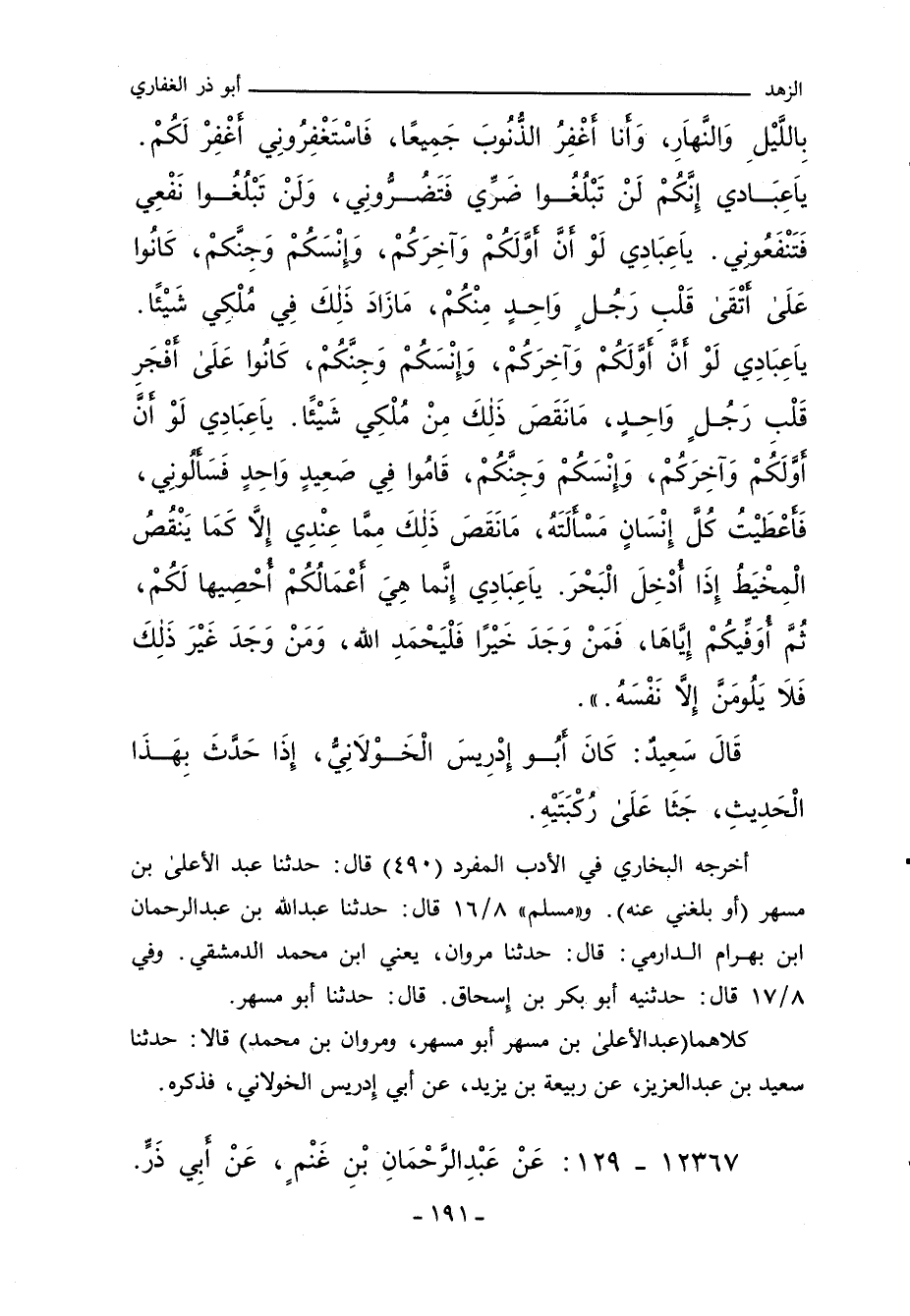 بِاللَّيْلِ وَالنَّهَارِ، وَأَنَا أَغْفِرُ الذُّنُوبَ جَمِيعًا، فَاسْتَغْفِرُونِي أَغْفِرْ لَكُمْ، يَا عِبَادِي، إِنَّكُمْ لَنْ تَبْلُغُوا ضَرِّي فَتَضُرُّونِي، وَلَنْ تَبْلُغُوا نَفْعِي فَتَنْفَعُونِي، يَا عِبَادِي، لَوْ أَنَّ أَوَّلَكُمْ وَآخِرَكُمْ، وَإِنْسَكُمْ وَجِنَّكُمْ، كَانُوا عَلَى أَتْقَى قَلْبِ رَجُلٍ وَاحِدٍ مِنْكُمْ، مَا زَادَ ذَلِكَ فِي مُلْكِي شَيْئًا، يَا عِبَادِي، لَوْ أَنَّ أَوَّلَكُمْ وَآخِرَكُمْ، وَإِنْسَكُمْ وَجِنَّكُمْ، كَانُوا عَلَى أَفْجَرِ قَلْبِ رَجُلٍ وَاحِدٍ، مَا نَقَصَ ذَلِكَ مِنْ مُلْكِي شَيْئًا، يَا عِبَادِي، لَوْ أَنَّ أَوَّلَكُمْ وَآخِرَكُمْ، وَإِنْسَكُمْ وَجِنَّكُمْ، قَامُوا فِي صَعِيدٍ وَاحِدٍ فَسَأَلُونِي، فَأَعْطَيْتُ كُلَّ إِنْسَانٍ مَسْأَلَتَهُ، مَا نَقَصَ ذَلِكَ مِمَّا عِنْدِي، إِلَاّ كَمَا يَنْقُصُ الْمِخْيَطُ إِذَا أُدْخِلَ الْبَحْرَ، يَا عِبَادِي، إِنَّمَا هِيَ أَعْمَالُكُمْ أُحْصِيهَا لَكُمْ، ثُمَّ أُوَفِّيكُمْ إِيَّاهَا، فَمَنْ وَجَدَ خَيْرًا، فَلْيَحْمَدِ اللهَ، وَمَنْ وَجَدَ غَيْرَ ذَلِكَ، فَلَا يَلُومَنَّ إِلَاّ نَفْسَهُ.