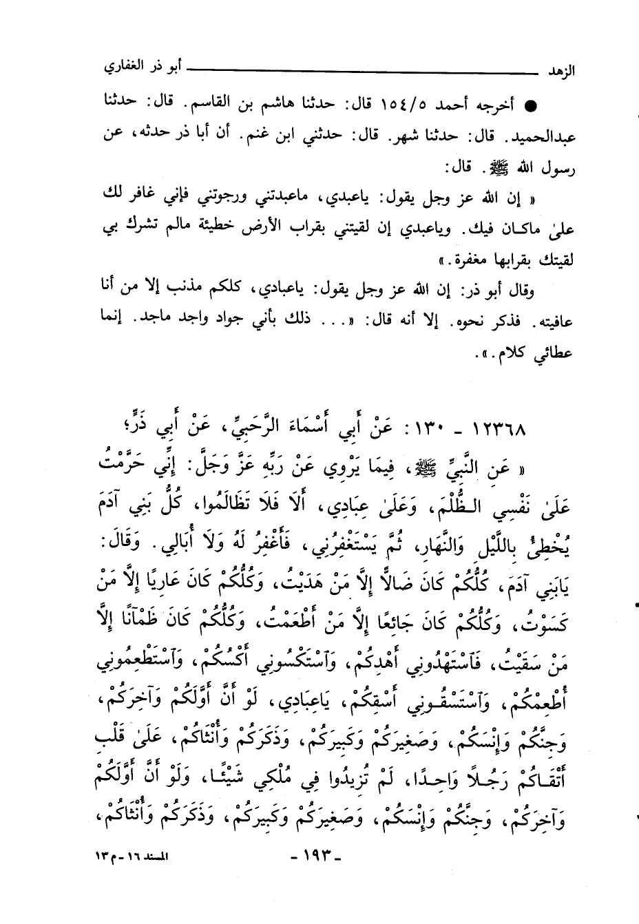 عَنِ النَّبِيِّ صلى الله عليه وسلم، فِيمَا يَرْوِي عَنْ رَبِّهِ، عَزَّ وَجَلَّ: إِنِّي حَرَّمْتُ عَلَى نَفْسِي الظُّلْمَ، وَعَلَى عِبَادِي، أَلَا فَلَا تَظَالَمُوا، كُلُّ بَنِي آدَمَ يُخْطِئُ بِاللَّيْلِ وَالنَّهَارِ، ثُمَّ يَسْتَغْفِرُنِي، فَأَغْفِرُ لَهُ وَلَا أُبَالِي، وَقَالَ: يَا بَنِي آدَمَ، كُلُّكُمْ كَانَ ضَالاًّ إِلَاّ مَنْ هَدَيْتُ، وَكُلُّكُمْ كَانَ عَارِيًا إِلَاّ مَنْ كَسَوْتُ، وَكُلُّكُمْ كَانَ جَائِعًا إِلَاّ مَنْ أَطْعَمْتُ، وَكُلُّكُمْ كَانَ ظَمْآنًا إِلَاّ مَنْ سَقَيْتُ، فَاسْتَهْدُونِي أَهْدِكُمْ، وَاسْتَكْسُونِي أَكْسُكُمْ، وَاسْتَطْعِمُونِي أُطْعِمْكُمْ، وَاسْتَسْقُونِي أَسْقِكُمْ، يَا عِبَادِي، لَوْ أَنَّ أَوَّلَكُمْ وَآخِرَكُمْ، وَجِنَّكُمْ وَإِنْسَكُمْ، وَصَغِيرَكُمْ وَكَبِيرَكُمْ، وَذَكَرَكُمْ وَأُنْثَاكُمْ - قَالَ عَبْدُ الصَّمَدِ: وَعَييِّكُمْ وَبَنِيكُمْ - عَلَى قَلْبِ أَتْقَاكُمْ رَجُلاً وَاحِدًا، لَمْ تَزِيدُوا فِي مُلْكِي شَيْئًا، وَلَوْ أَنَّ أَوَّلَكُمْ وَآخِرَكُمْ، وَجِنَّكُمْ وَإِنْسَكُمْ، وَصَغِيرَكُمْ وَكَبِيرَكُمْ، وَذَكَرَكُمْ وَأُنْثَاكُمْ،
