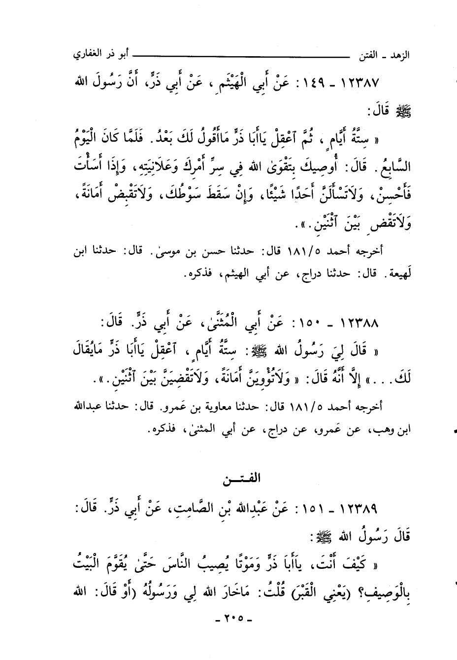 قَالَ لِي رَسُولُ اللهِ صلى الله عليه وسلم: سِتَّةَ أَيَّامٍ، اعْقِلْ يَا أَبَا ذَرٍّ مَا يُقَالُ لَكَ ... إِلَاّ أَنَّهُ قَالَ: وَلَا تُؤْوِيَنَّ أَمَانَةً، وَلَا تَقْضِيَنَّ بَيْنَ اثْنَيْنِ.