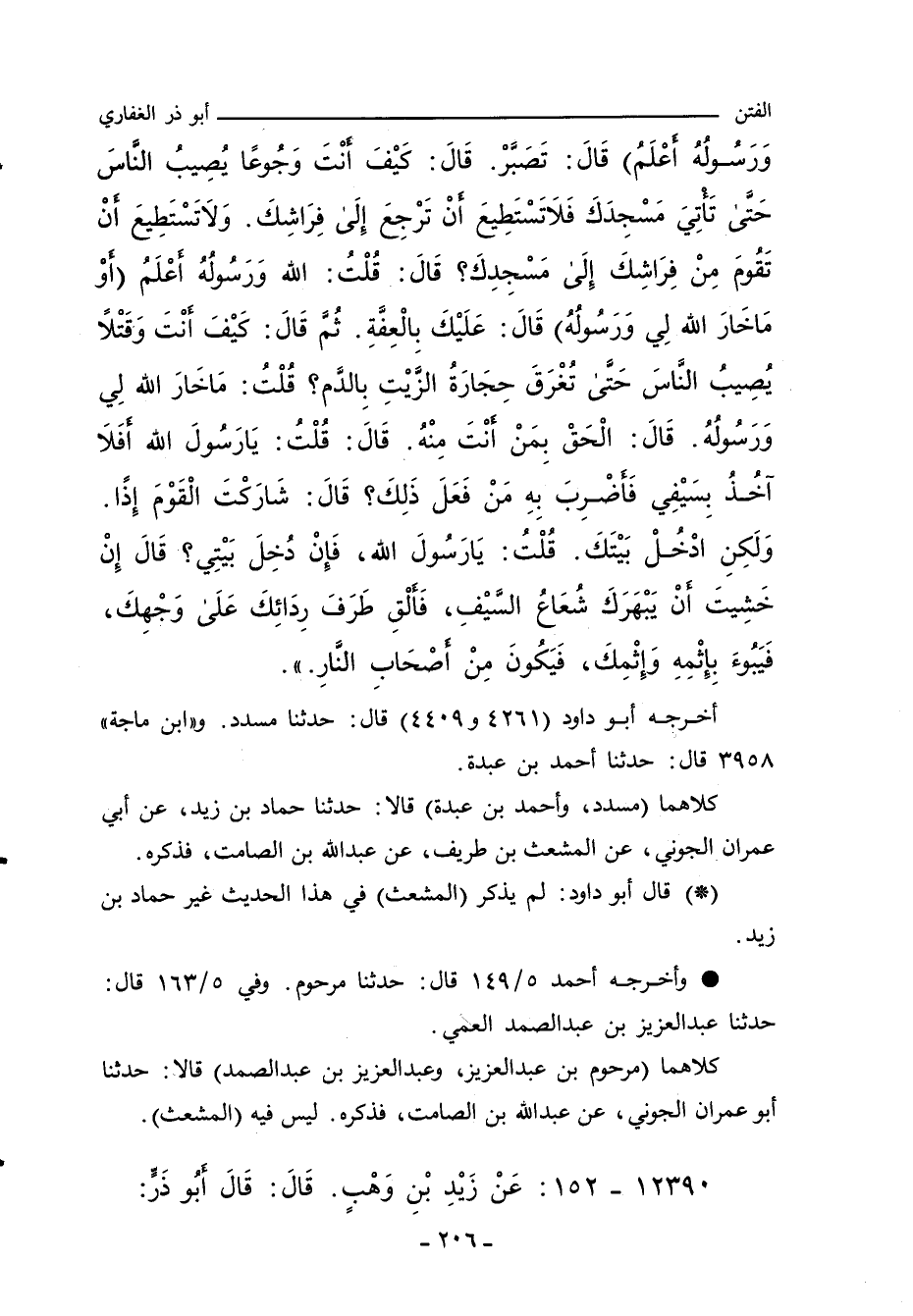 وَرَسُولُهُ أَعْلَمُ، قَالَ: تَصَبَّرْ، قَالَ: كَيْفَ أَنْتَ وَجُوعًا يُصِيبُ النَّاسَ، حَتَّى تَأْتِيَ مَسْجِدَكَ فَلَا تَسْتَطِيعَ أَنْ تَرْجِعَ إِلَى فِرَاشِكَ، وَلَا تَسْتَطِيعَ أَنْ تَقُومَ مِنْ فِرَاشِكَ إِلَى مَسْجِدِكَ؟ قَالَ: قُلْتُ: اللَّهُ وَرَسُولُهُ أَعْلَمُ، أَوْ مَا خَارَ اللَّهُ لِي وَرَسُولُهُ، قَالَ: عَلَيْكَ بِالْعِفَّةِ، ثُمَّ قَالَ: كَيْفَ أَنْتَ وَقَتْلاً يُصِيبُ النَّاسَ، حَتَّى تُغْرَقَ حِجَارَةُ الزَّيْتِ بِالدَّمِ؟ قُلْتُ: مَا خَارَ اللَّهُ لِي وَرَسُولُهُ، قَالَ: الْحَقْ بِمَنْ أَنْتَ مِنْهُ؟ قَالَ: قُلْتُ: يَا رَسُولَ اللهِ، أَفَلَا آخُذُ بِسَيْفِي فَأَضْرِبَ بِهِ مَنْ فَعَلَ ذَلِكَ؟ قَالَ: شَارَكْتَ الْقَوْمَ إِذًا، وَلَكِنِ ادْخُلْ بَيْتَكَ، قُلْتُ: يَا رَسُولَ اللهِ، فَإِنْ دُخِلَ بَيْتِي؟ قَالَ: إِنْ خَشِيتَ أَنْ يَبْهَرَكَ شُعَاعُ السَّيْفِ، فَأَلْقِ طَرَفَ رِدَائِكَ عَلَى وَجْهِكَ، فَيَبُوءَ بِإِثْمِهِ وَإِثْمِكَ، فَيَكُونَ مِنْ أَصْحَابِ النَّارِ.