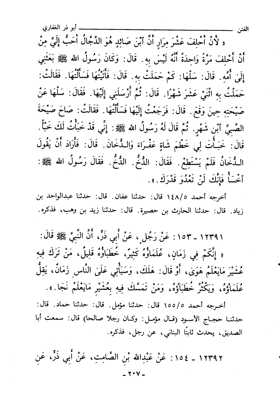 لأَنْ أَحْلِفَ عَشْرَ مِرَارٍ أَنَّ ابْنَ صَائِدٍ هُوَ الدَّجَّالُ، أَحَبُّ إِلَيَّ مِنْ أَنْ أَحْلِفَ مَرَّةً وَاحِدَةً أَنَّهُ لَيْسَ بِهِ، قَالَ: وَإِنَ رَسُولُ اللهِ صلى الله عليه وسلم بَعَثَنِى إِلَى أُمِّهِ، قَالَ: سَلْهَا كَمْ حَمَلَتْ بِهِ؟ قَالَ: فَأَتَيْتُهَا فَسَأَلْتُهَا، فَقَالَتْ: حَمَلْتُ بِهِ اثْنَيْ عَشَرَ شَهْرًا، قَالَ: ثُمَّ أَرْسَلَنِي إِلَيْهَا، فَقَالَ: سَلْهَا عَنْ صَيْحَتِهِ حِينَ وَقَعَ؟ قَالَ: فَرَجَعْتُ إِلَيْهَا، فَسَأَلْتُهَا، فَقَالَتْ: صَاحَ صَيْحَةَ الصَّبِيِّ ابْنِ شَهْرٍ، ثُمَّ قَالَ لَهُ رَسُولُ اللهِ صلى الله عليه وسلم: إِنِّي قَدْ خَبَأْتُ لَكَ خَبْئًا، قَالَ: خَبَأْتَ لِي خَطْمَ شَاةٍ عَفْرَاءَ، وَالدُّخَانَ، قَالَ: فَأَرَادَ أَنْ يَقُولَ الدُّخَانَ فَلَمْ يَسْتَطِعْ، فَقَالَ: الدُّخُّ، الدُّخُّ، فَقَالَ رَسُولُ اللهِ صلى الله عليه وسلم: اخْسَأْ، فَإِنَّكَ لَنْ تَعْدُوَ قَدْرَكَ.